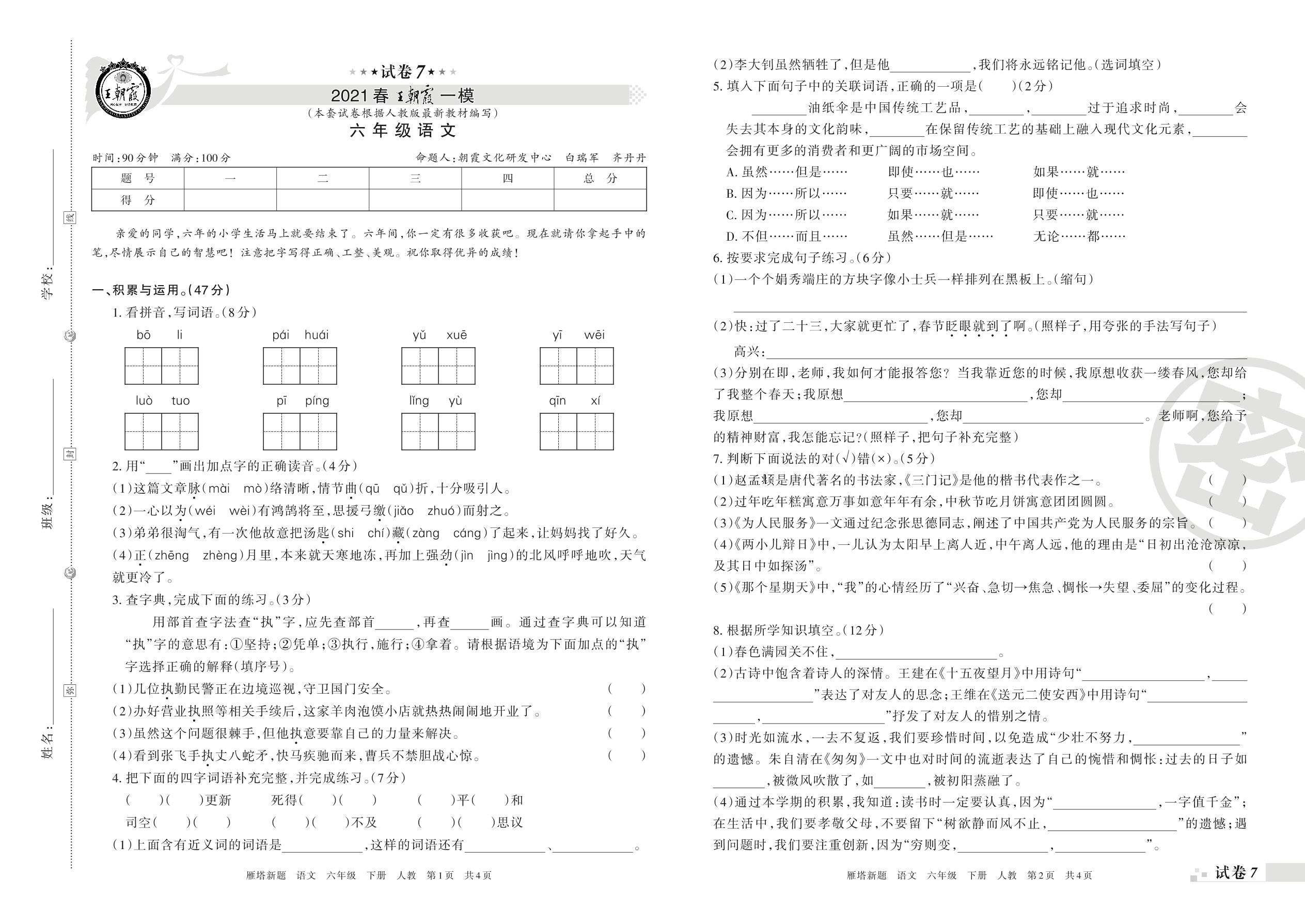 王朝霞期末模拟卷六年级下册语文(人教版)_R210801232658【7】