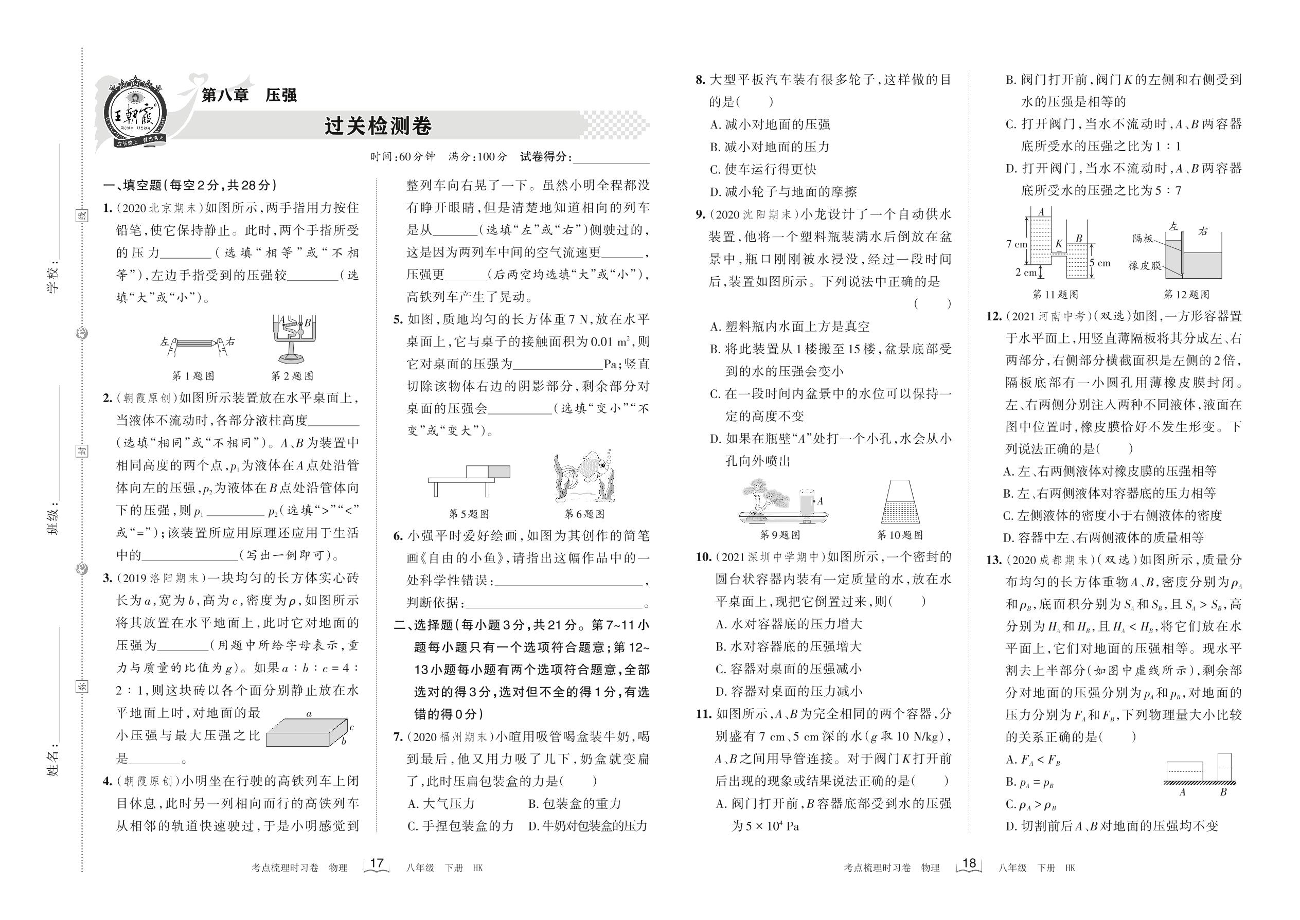 2021-2022学年八年级物理沪科版 第八章 过关检测卷