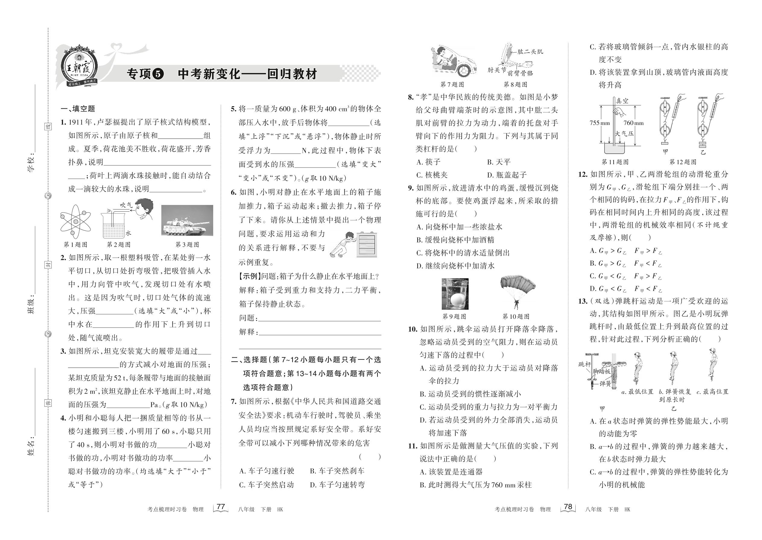 2022下册八年级物理沪科版 专项5 中考新变化——回归教材