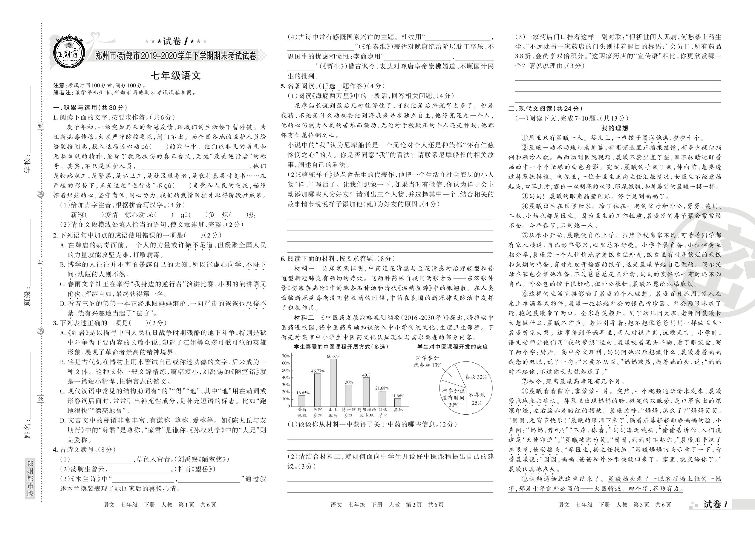 2019-2020学年第二学期郑州市、新郑市七年级语文试卷(人教版)【1】