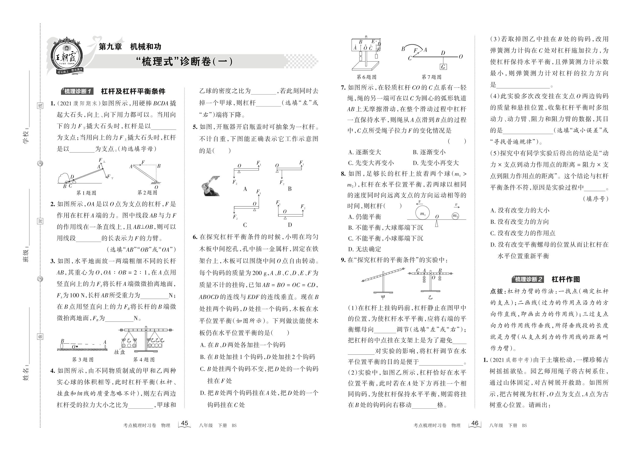 2022下册八年级物理北师版 第九章 “梳理式”诊断卷(一)