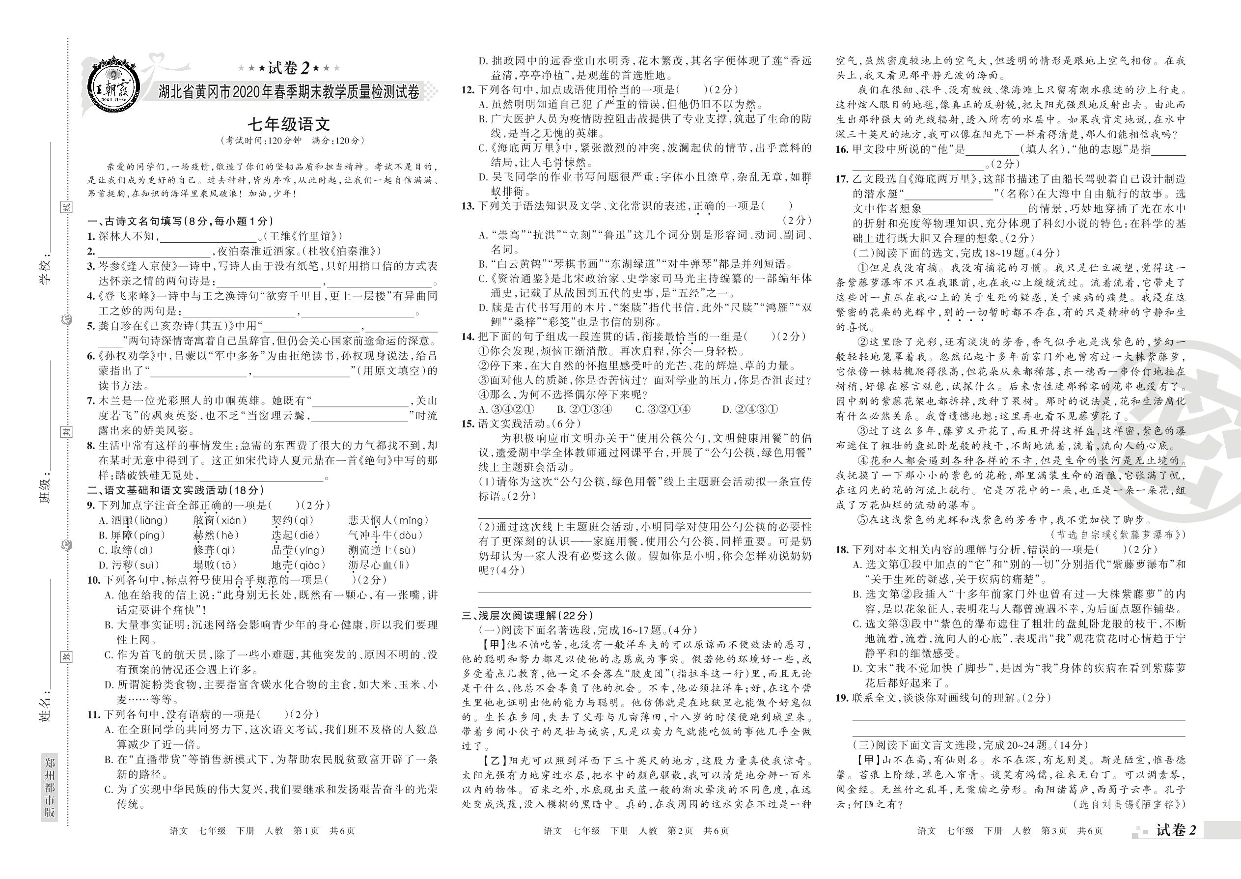 2019-2020学年第二学期湖北省黄冈市七年级语文试卷(人教版)【2】