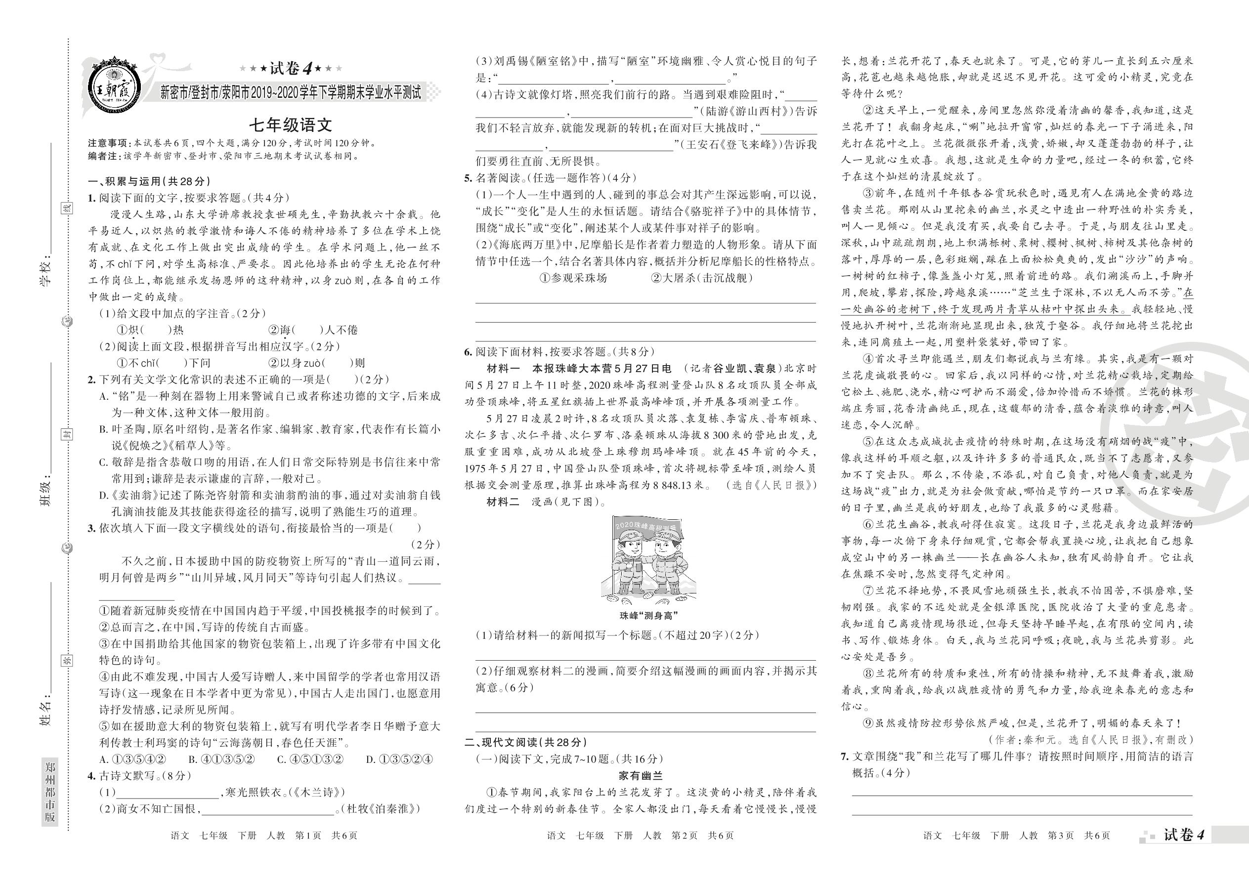 2019-2020学年第二学期新密市、登封市、荥阳市七年级语文试卷(人教版)【4】