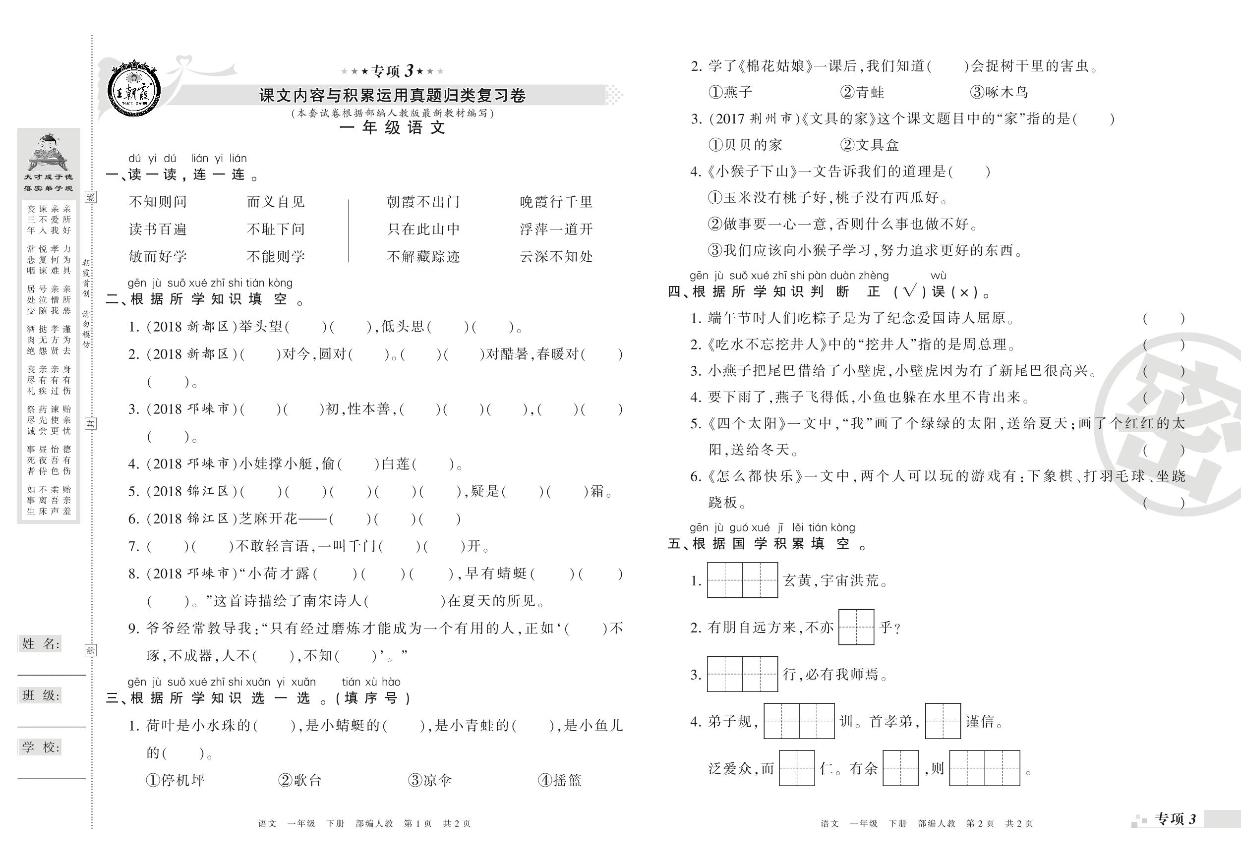 王朝霞期末专项卷——课文内容与积累运用、阅读与写话真题归类复习一年级下册语文(人教版)_R210731182816【0】