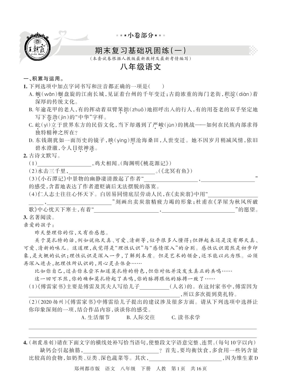 王朝霞期末复习巩固基础练八年级下册语文(人教版)【0】