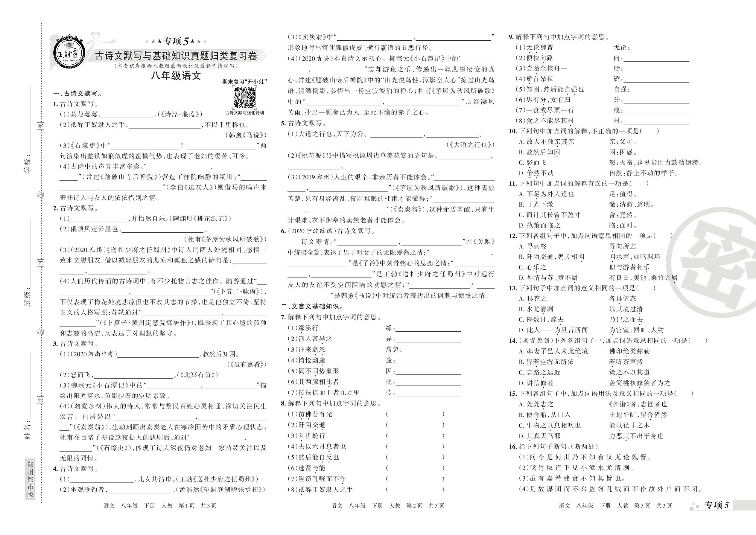 王朝霞期末专项卷——古诗文默写与基础知识、课内文言文阅读真题归类复习八年级下册语文(人教版)_R210801233014【0】