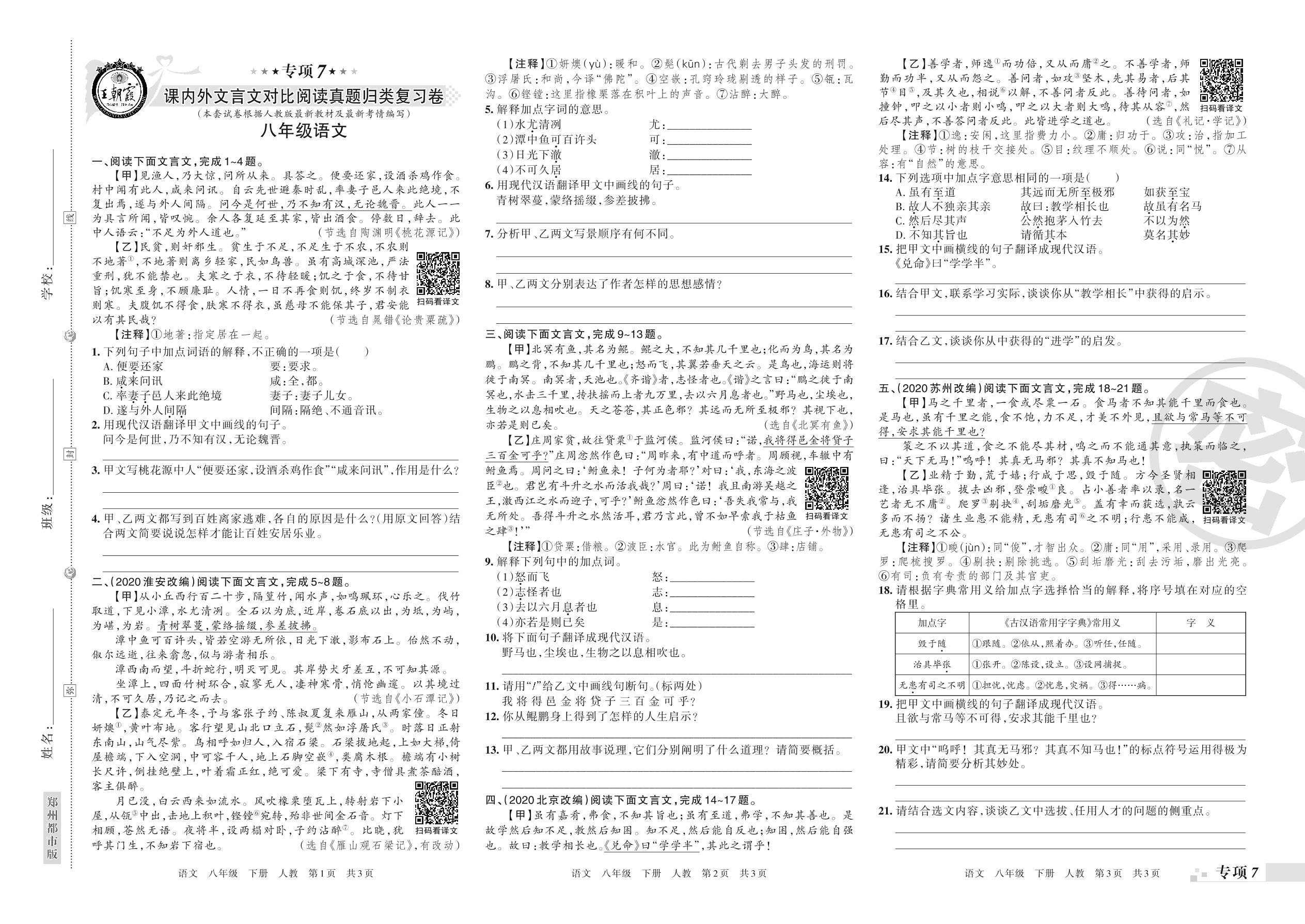 王朝霞期末专项卷——课内外文言文对比阅读、古诗词阅读真题归类复习八年级下册语文(人教版)_R210801233024【0】