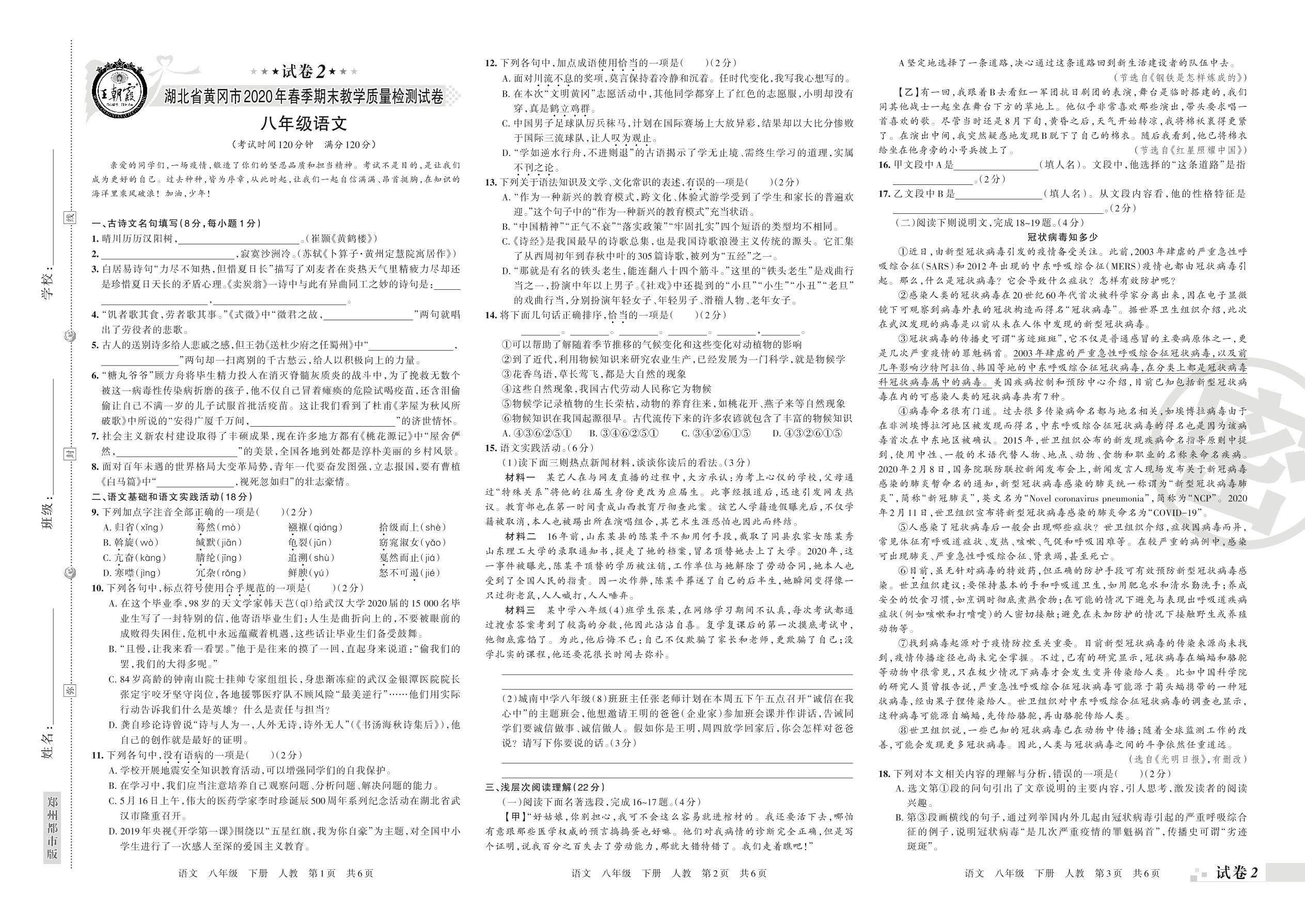 2019-2020学年第二学期湖北省黄冈市八年级语文试卷(人教版)【2】