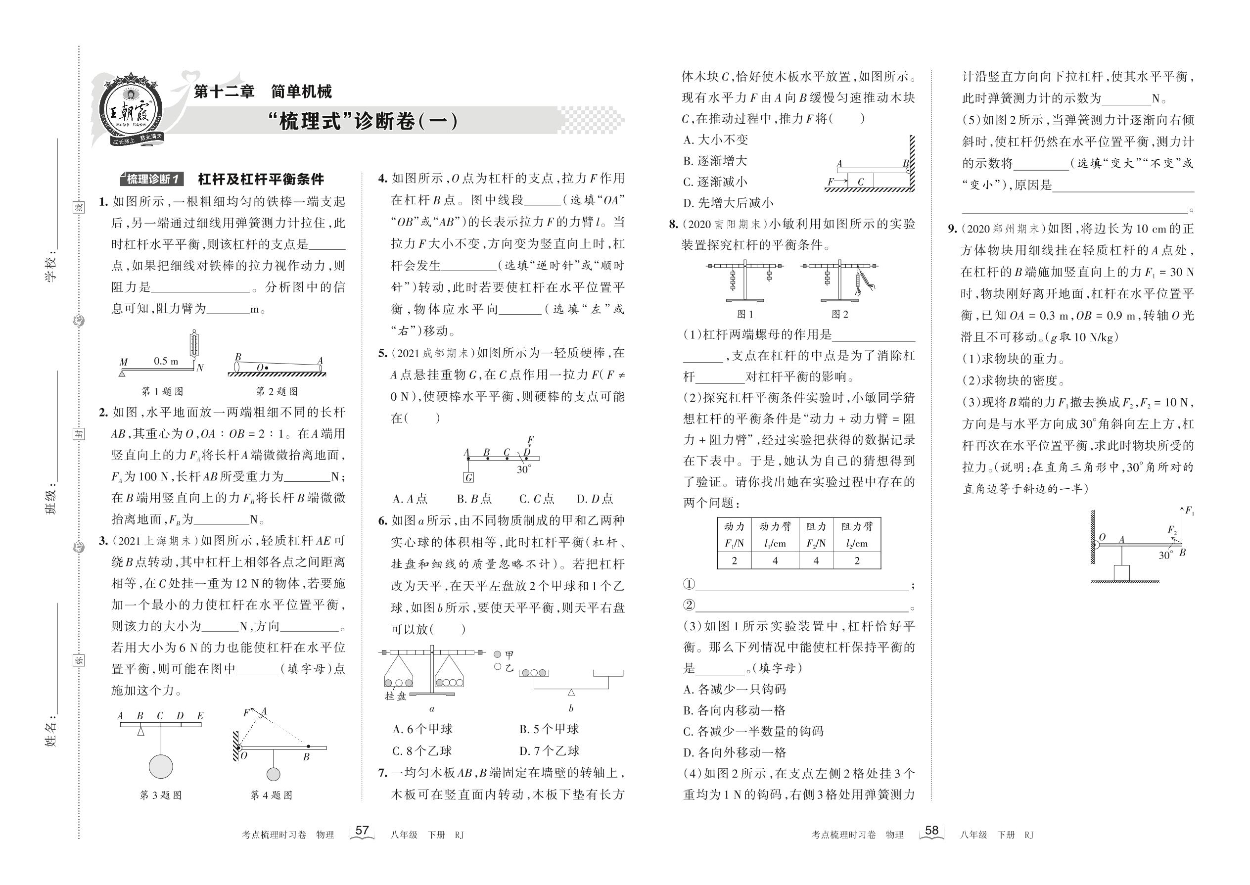 2022下册八年级物理人教版 第十二章 “梳理式”诊断卷(一)