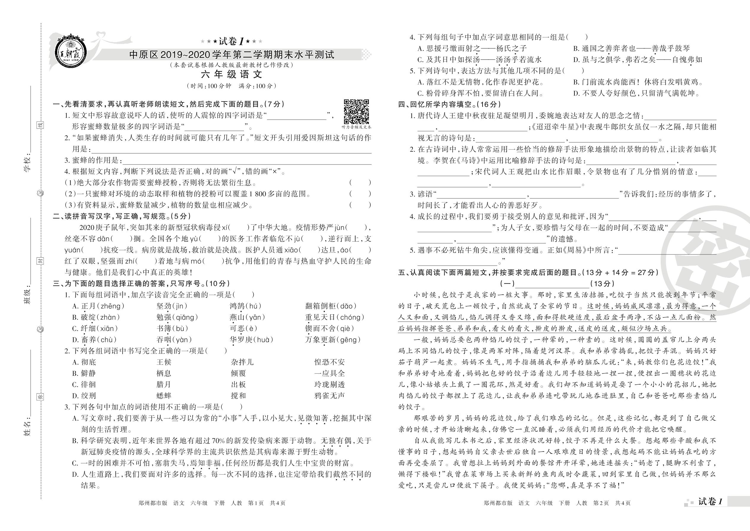 2019-2020学年第二学期郑州市中原区六年级语文试卷(人教版)【1】