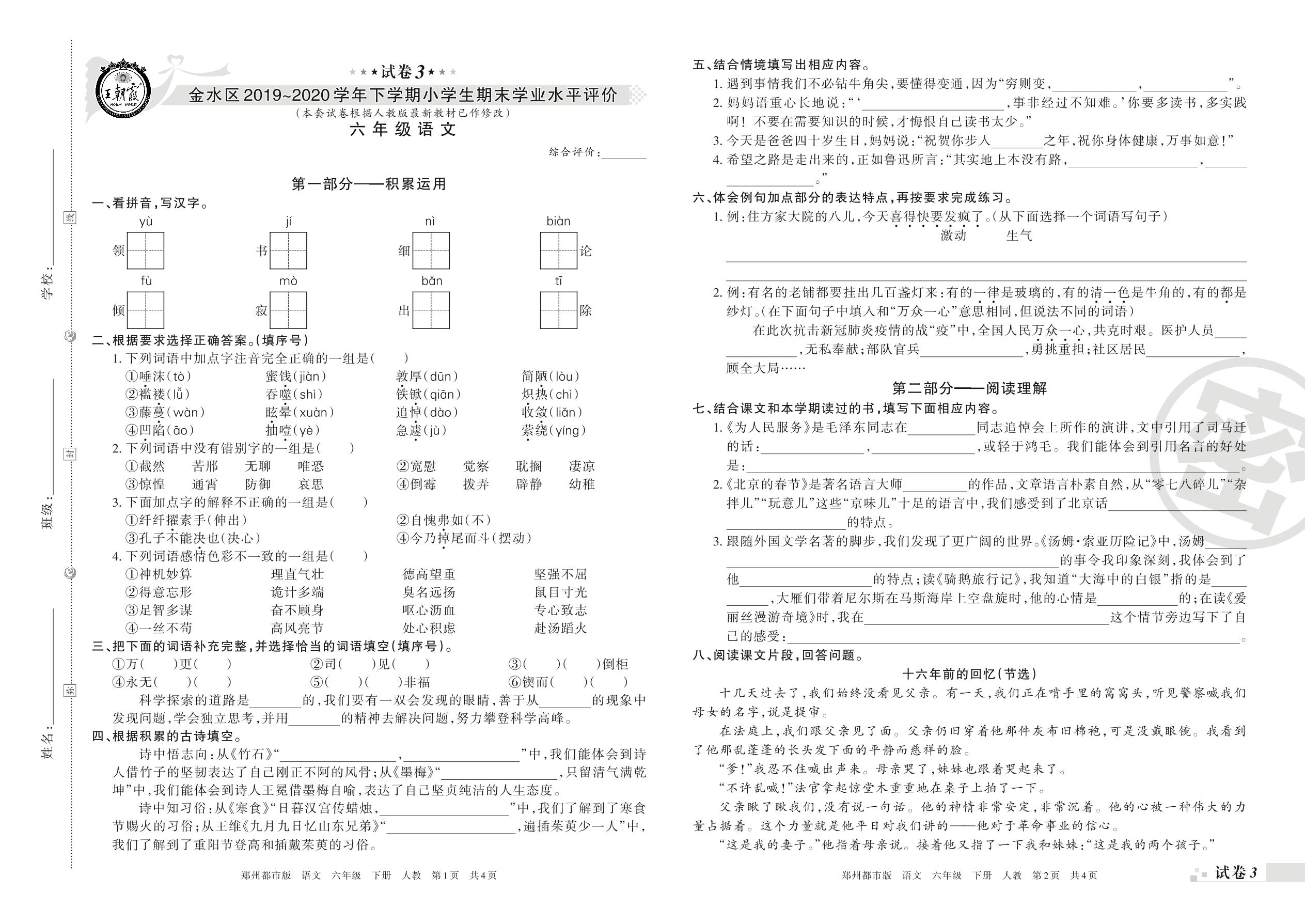 2019-2020学年第二学期郑州市金水区六年级语文试卷(人教版)【3】