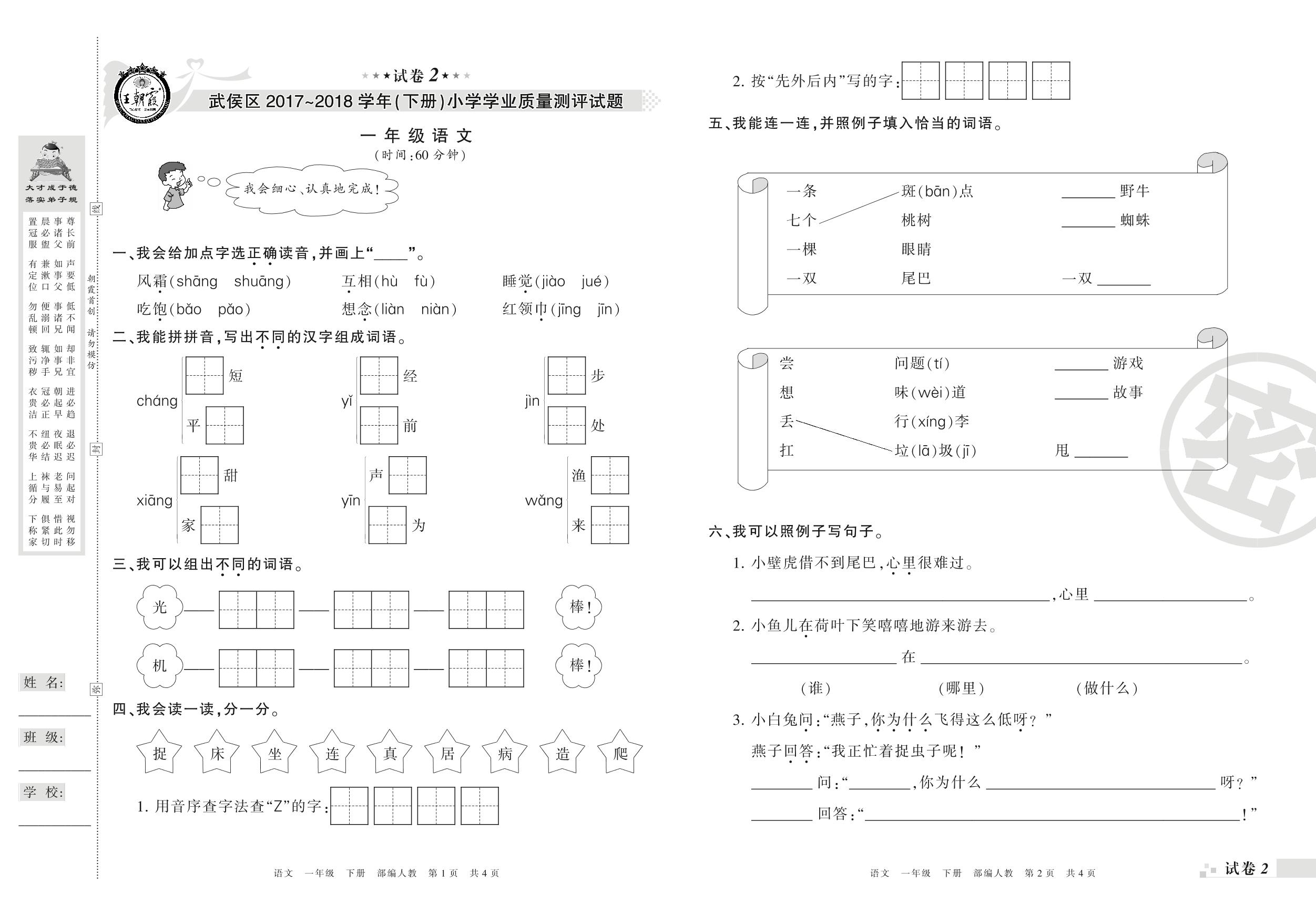 2017-2018学年第二学期成都市武侯区一年级语文试卷(人教版)【2】