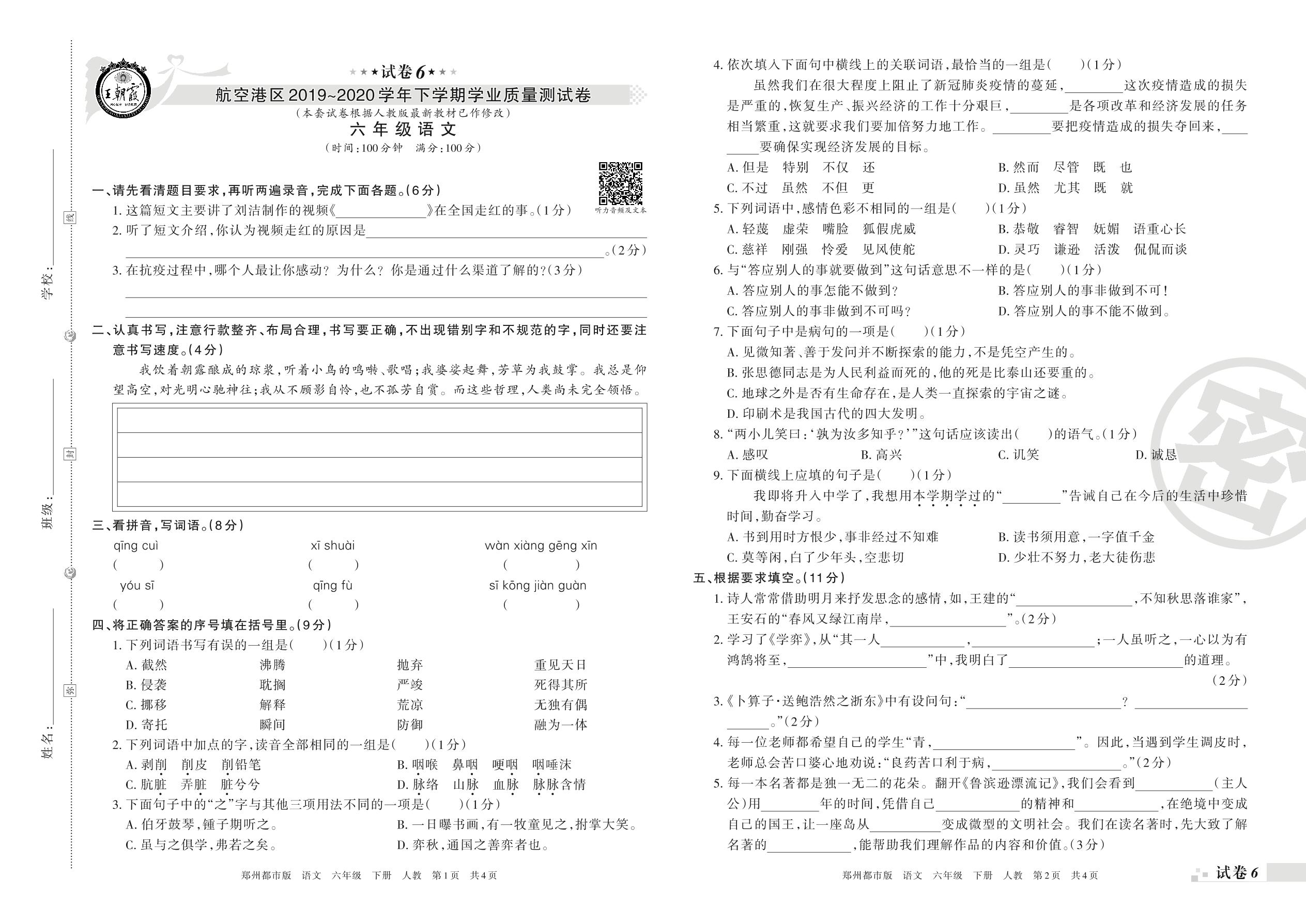 2019-2020学年第二学期郑州市航空港区六年级语文试卷(人教版)【6】