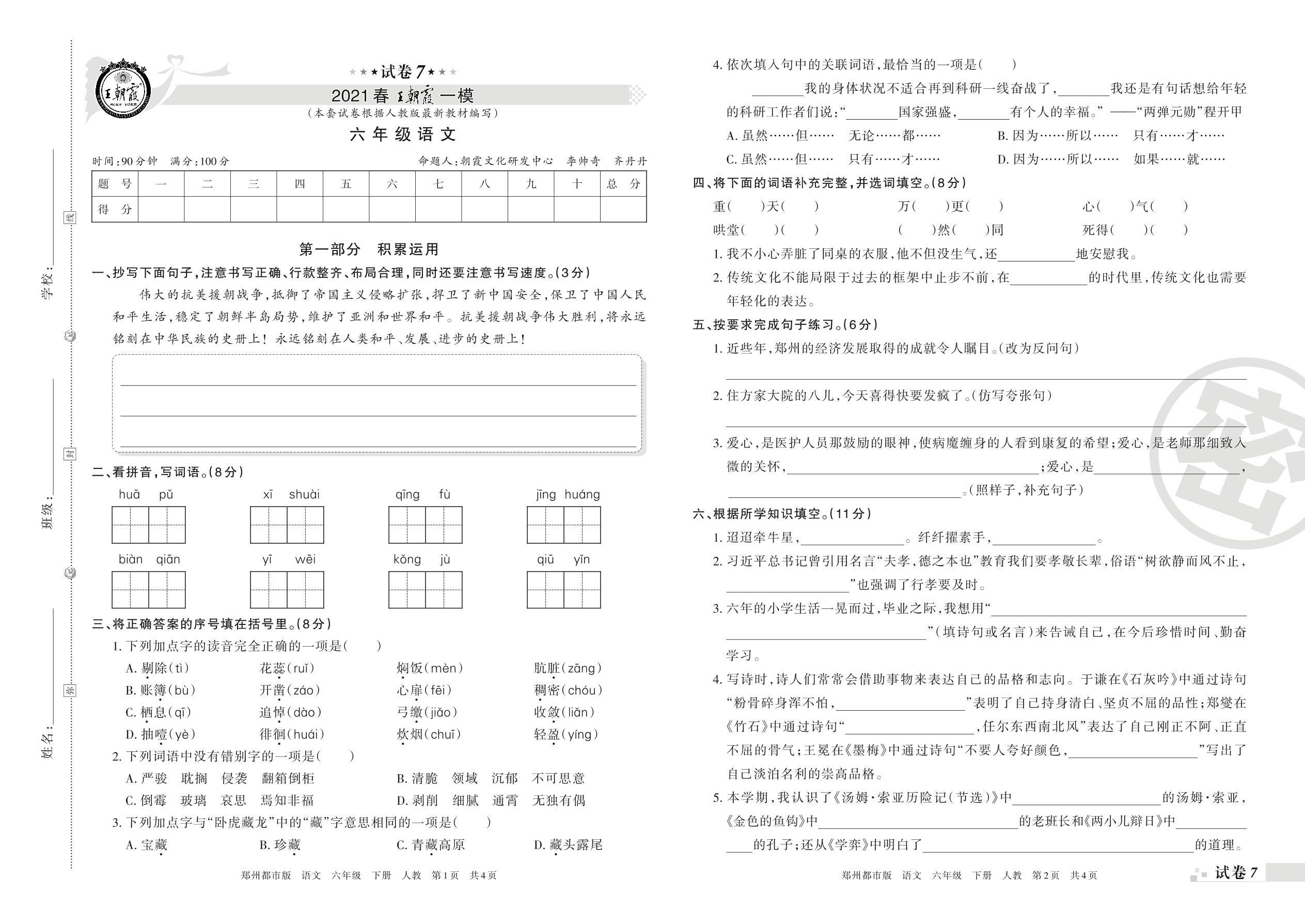 王朝霞期末模拟卷六年级下册语文(人教版)_R210801233326【7】