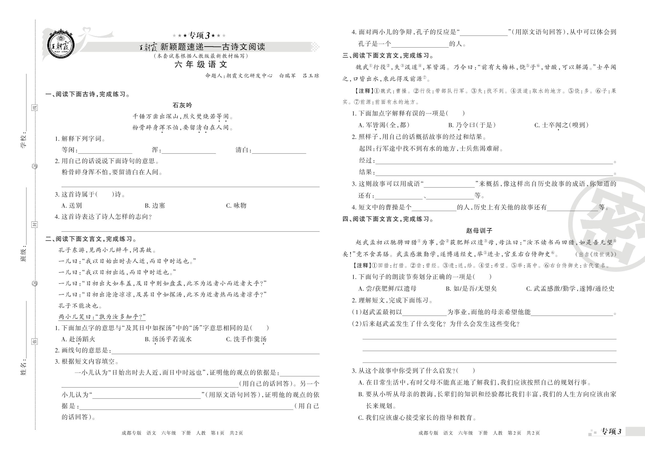 王朝霞期末专项卷——古诗文阅读、阅读理解真题归类复习六年级下册语文(人教版)_R210801233405【0】