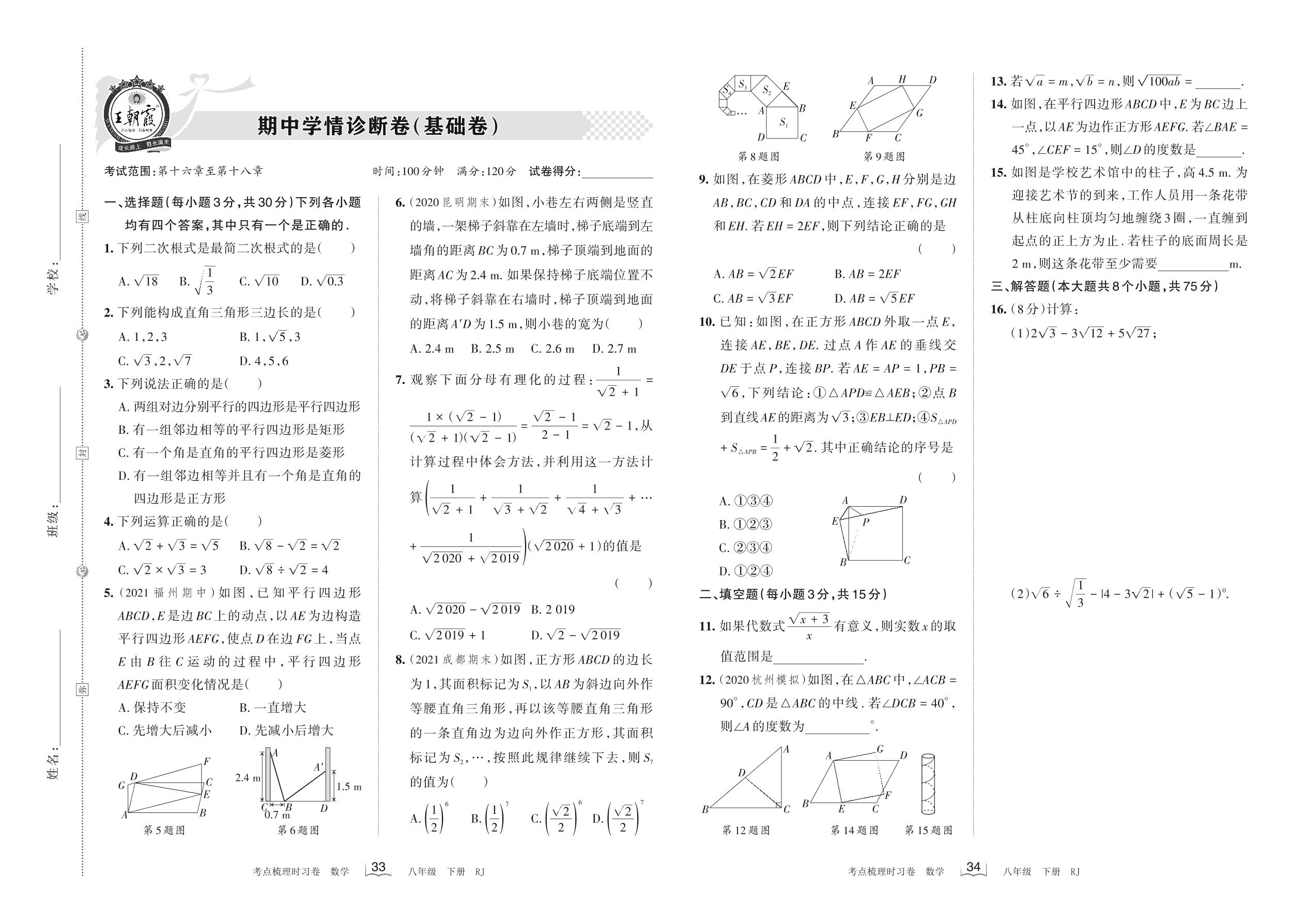 2022下册八年级数学人教版 期中学情诊断卷(基础卷)
