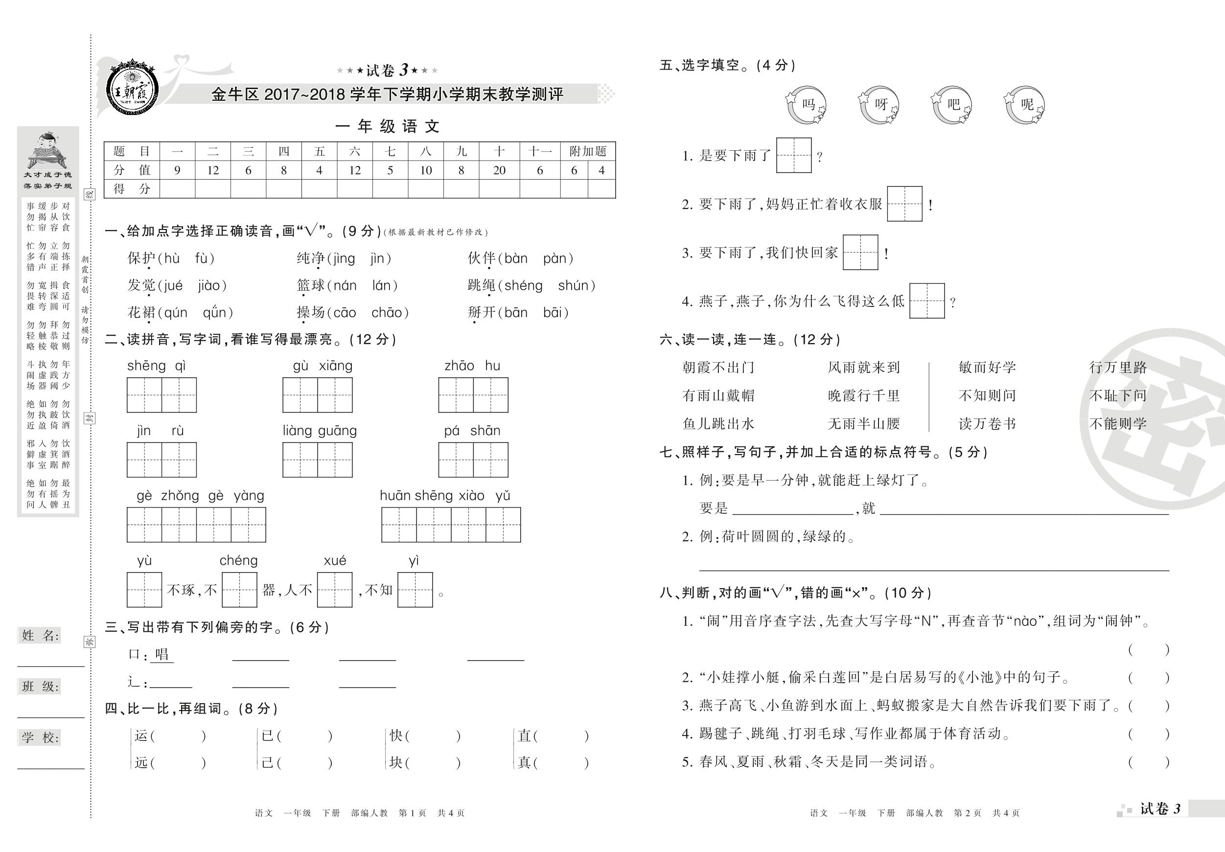 2017-2018学年第二学期成都市金牛区一年级语文试卷(人教版)【3】