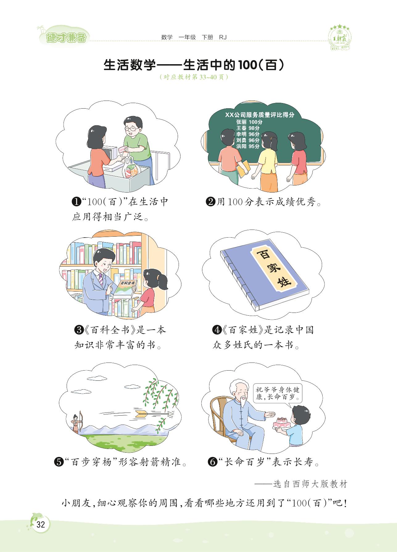 2022下册一年级数学人教版 第四单元——生活数学 生活中的100(百)