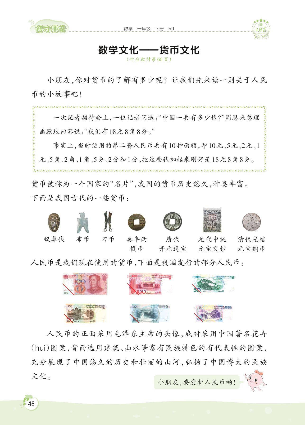 2022下册一年级数学人教版 第五单元——数学文化 货币文化