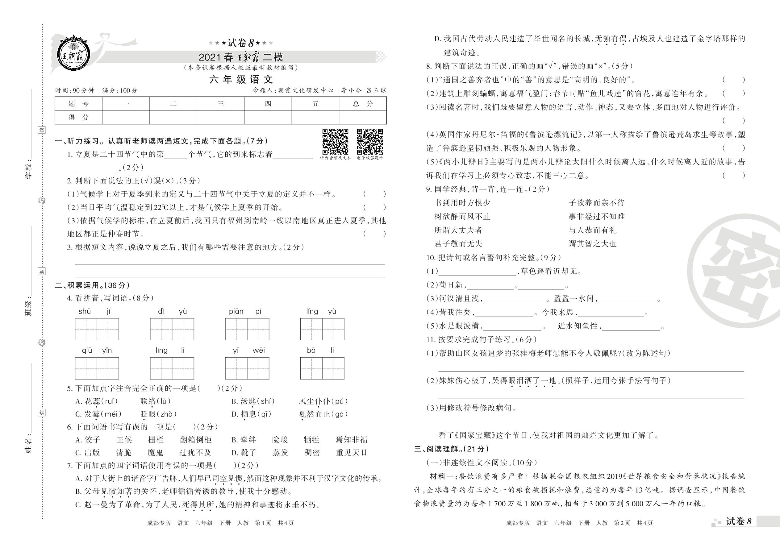 王朝霞期末模拟卷六年级下册语文(人教版)_R210801233458【8】
