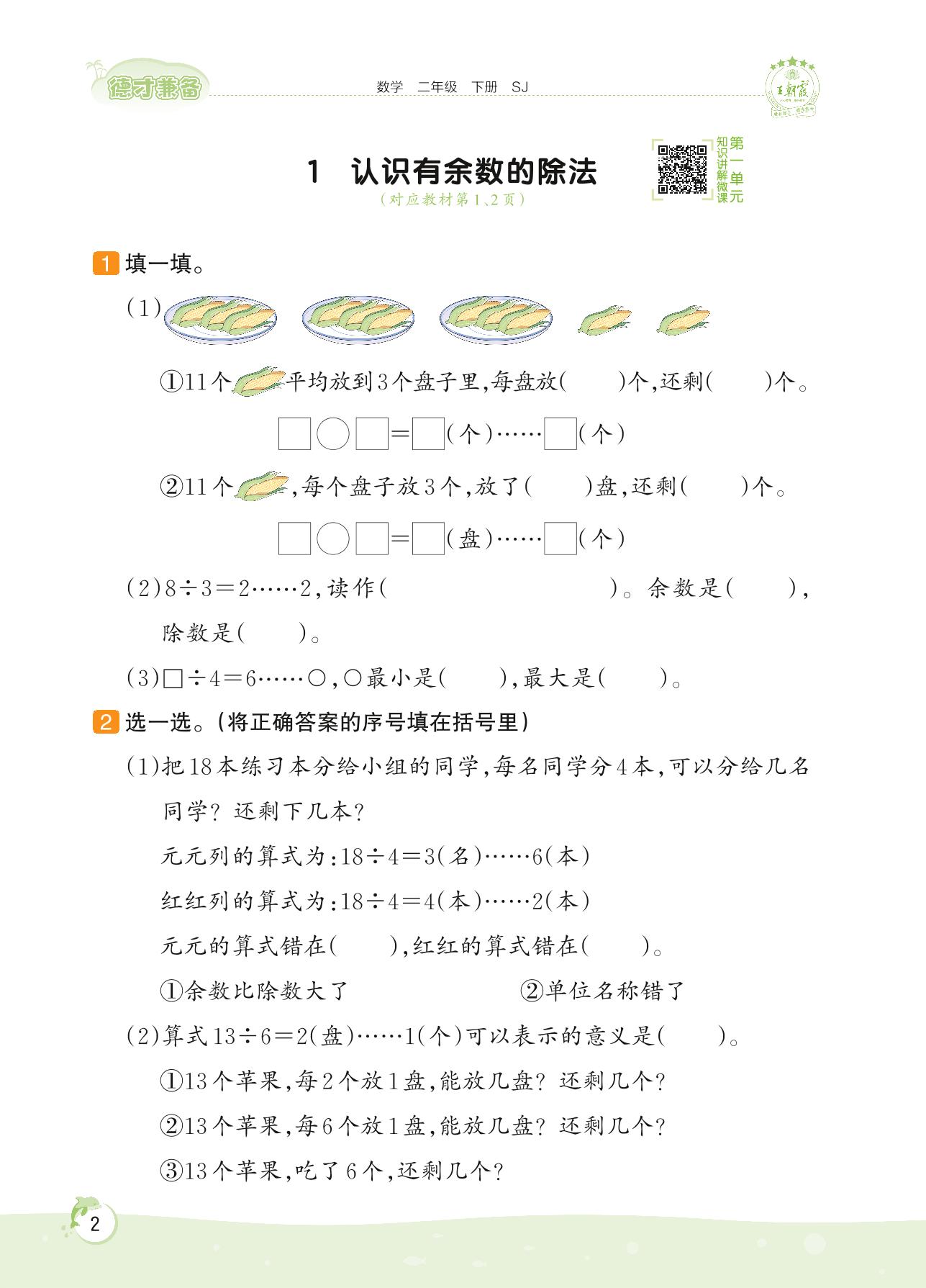 2022下册二年级数学苏教版 第一单元——1 认识有余数的除法