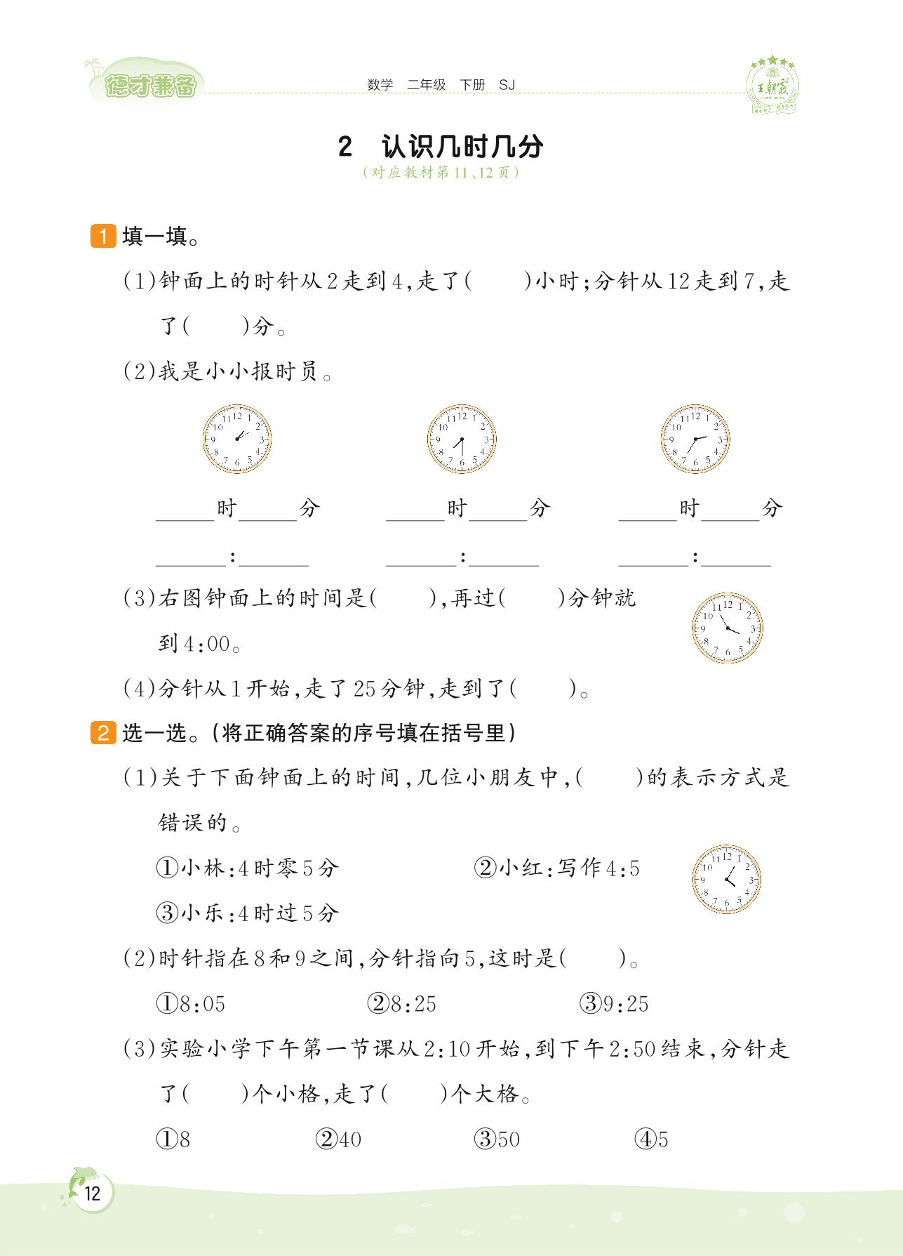 2022下册二年级数学苏教版 第二单元——2 认识几时几分