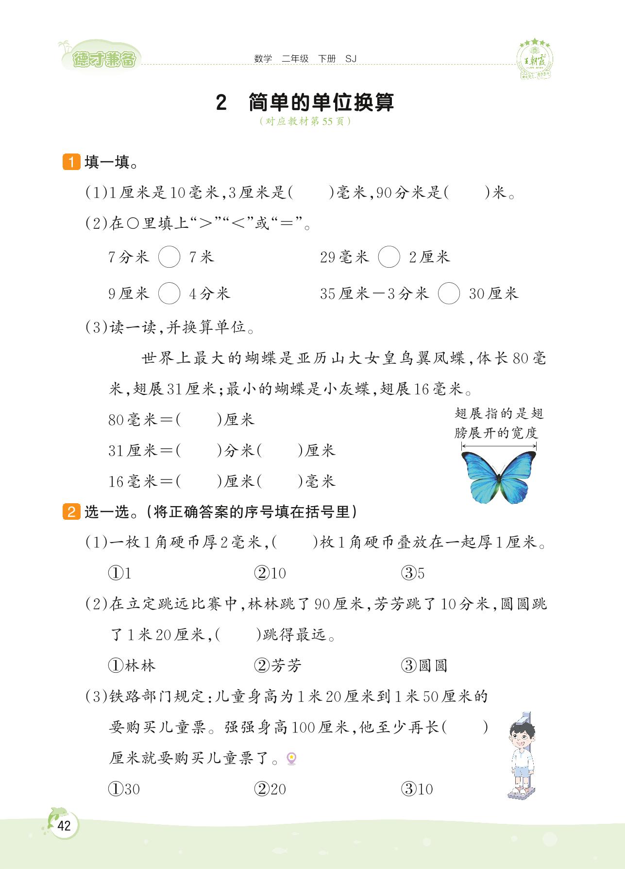 2022下册二年级数学苏教版 第五单元——2 简单的单位换算