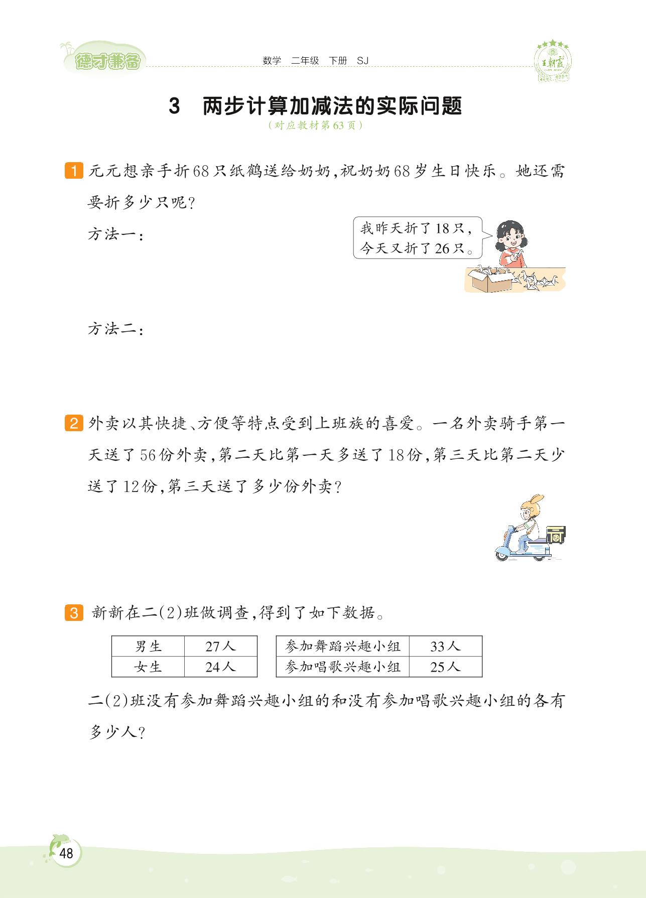 2022下册二年级数学苏教版 第六单元——3 两步计算加减法的实际问题