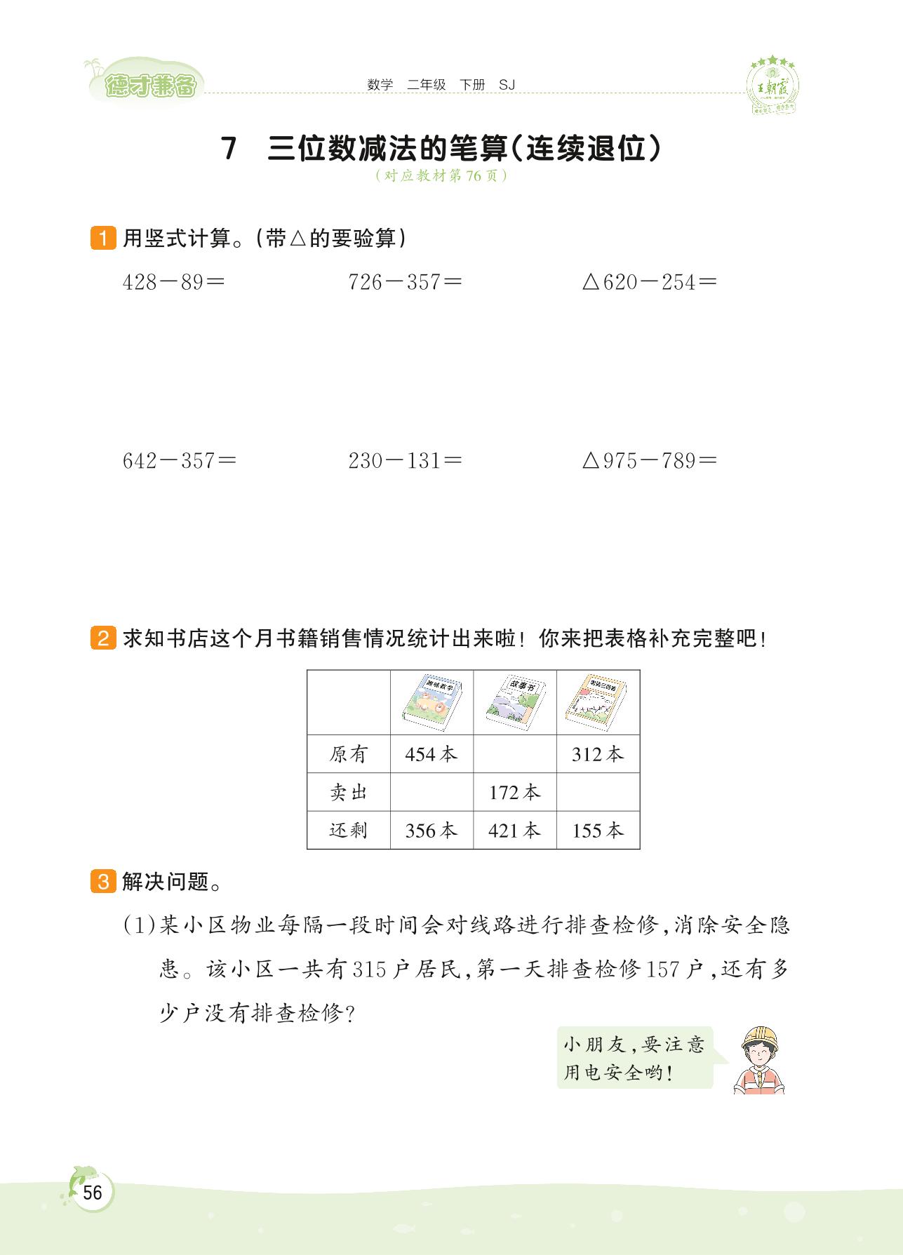 2022下册二年级数学苏教版 第六单元——7 三位数减法的笔算(连续退位)