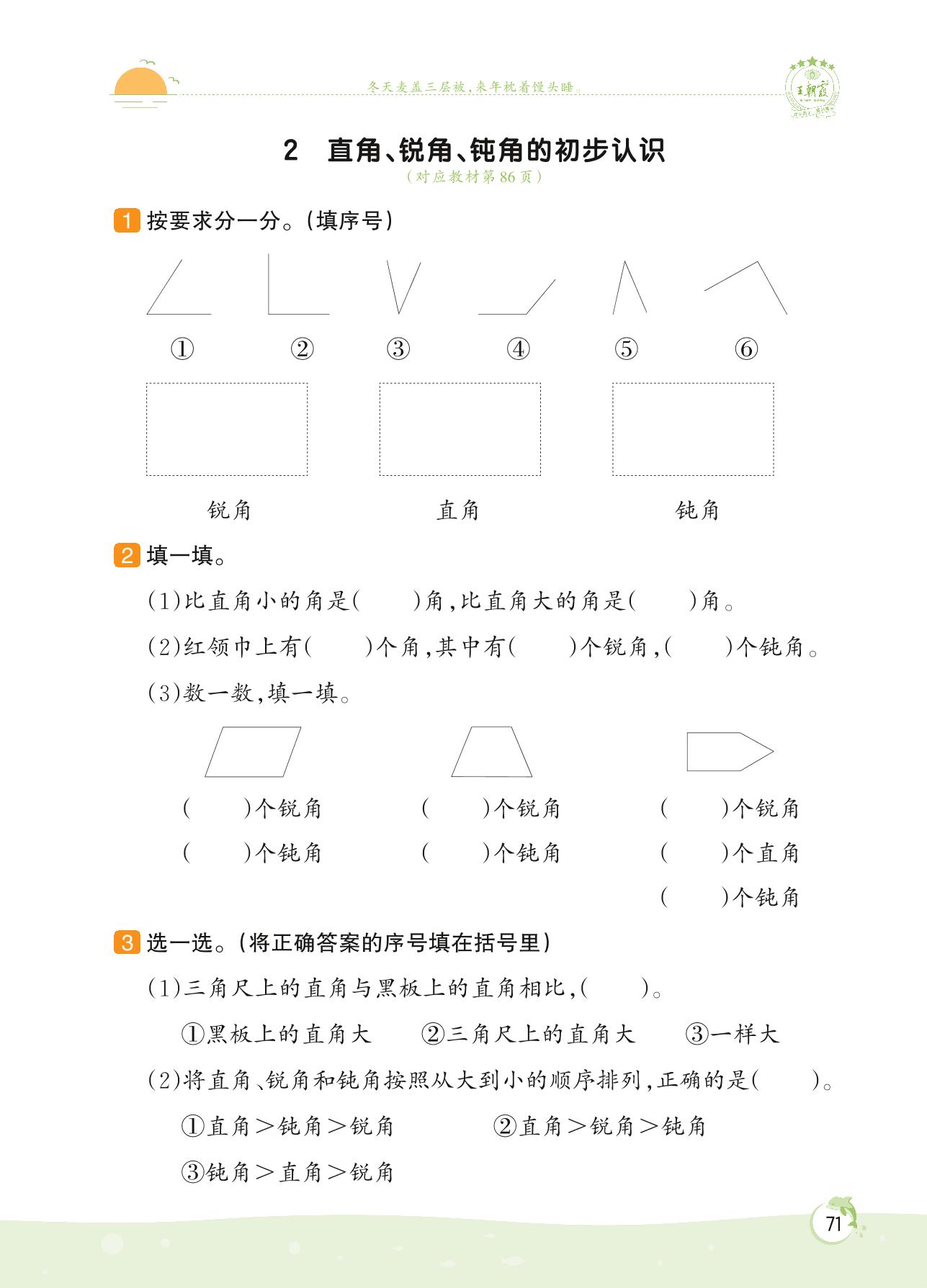 2022下册二年级数学苏教版 第七单元——2 直角、锐角、钝角的初步认识