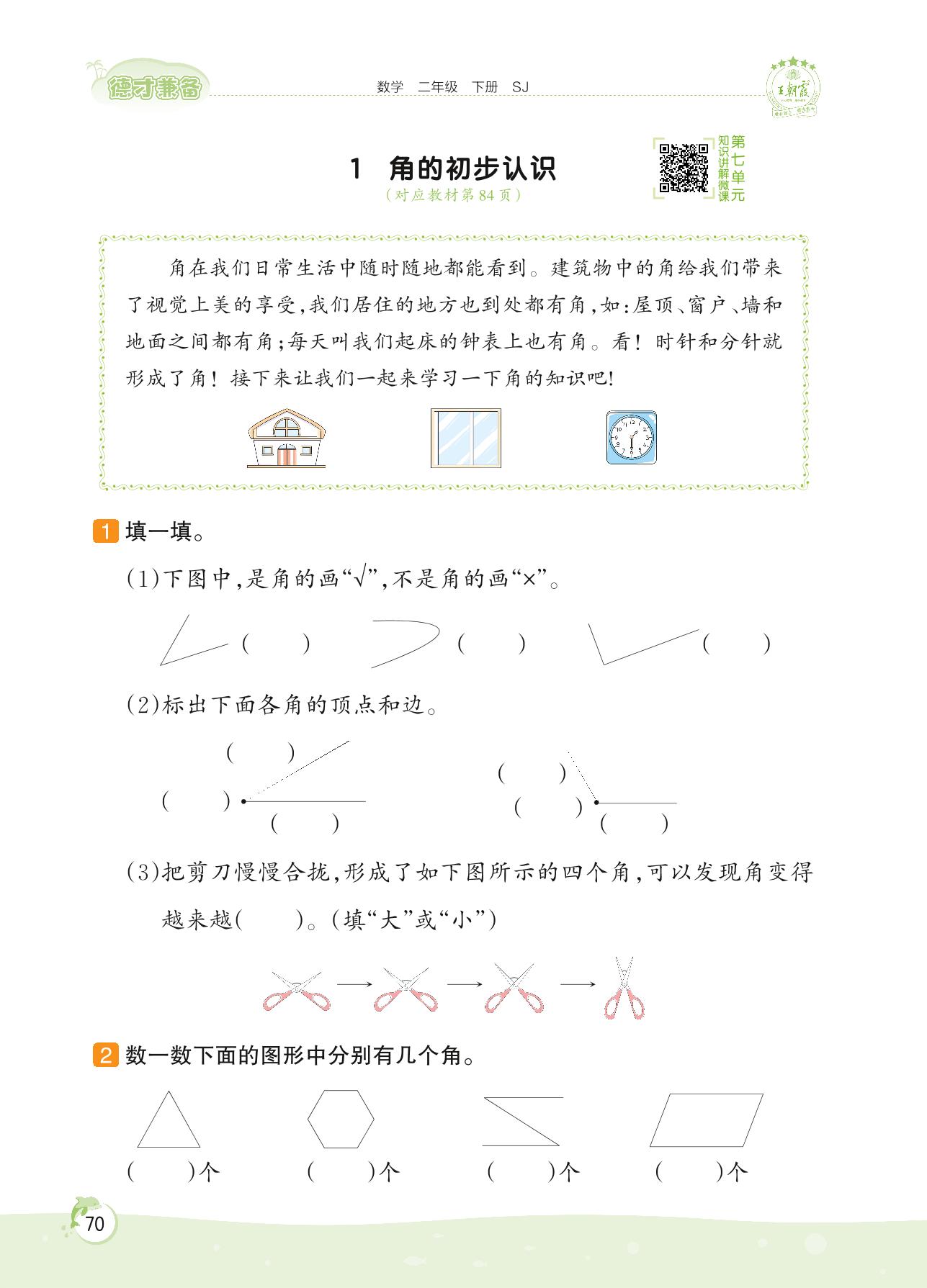 2022下册二年级数学苏教版 第七单元——1 角的初步认识