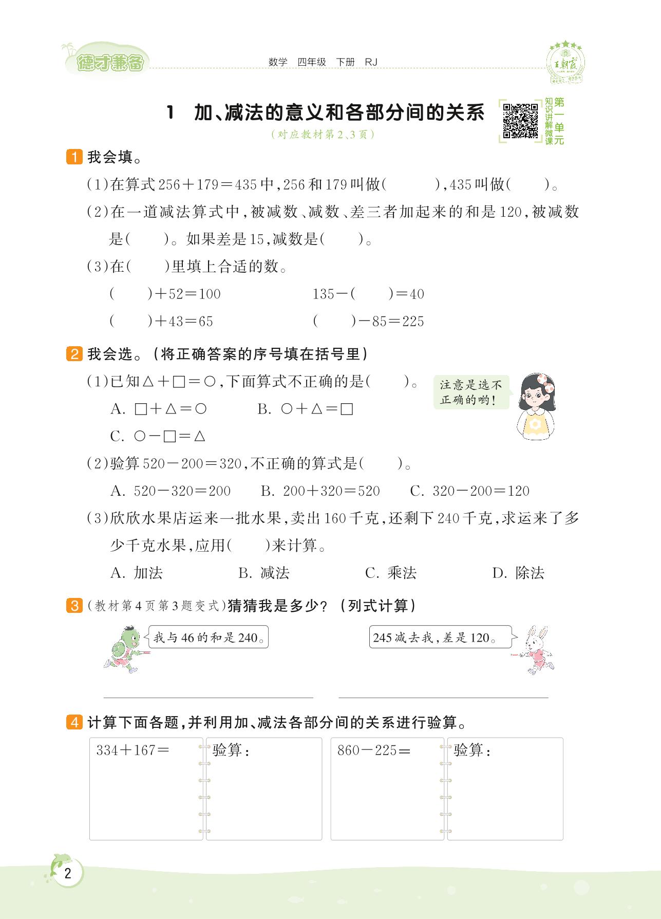 2022下册四年级数学人教版 第一单元——1 加、减法的意义和各部分间的关系