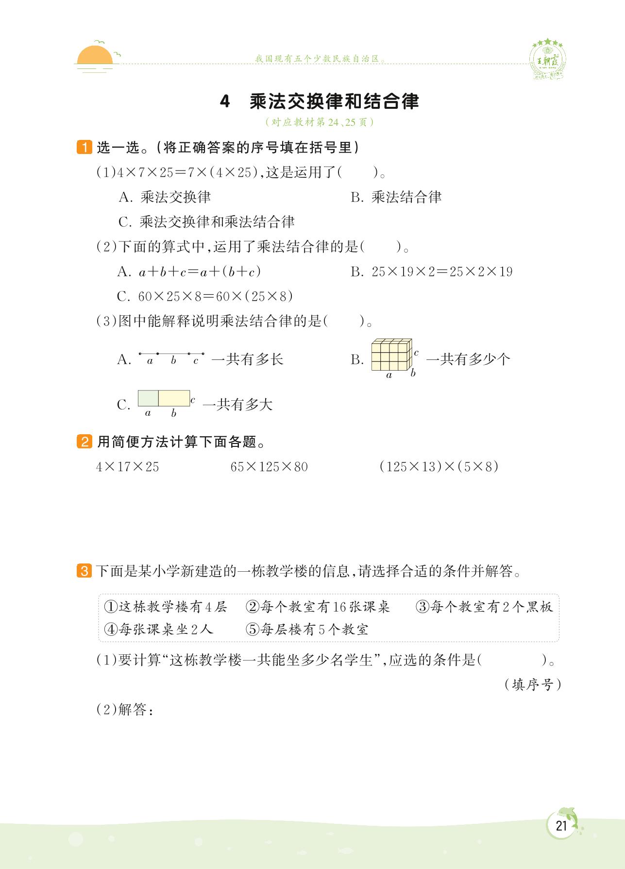 2022下册四年级数学人教版 第三单元——4 乘法交换律和结合律