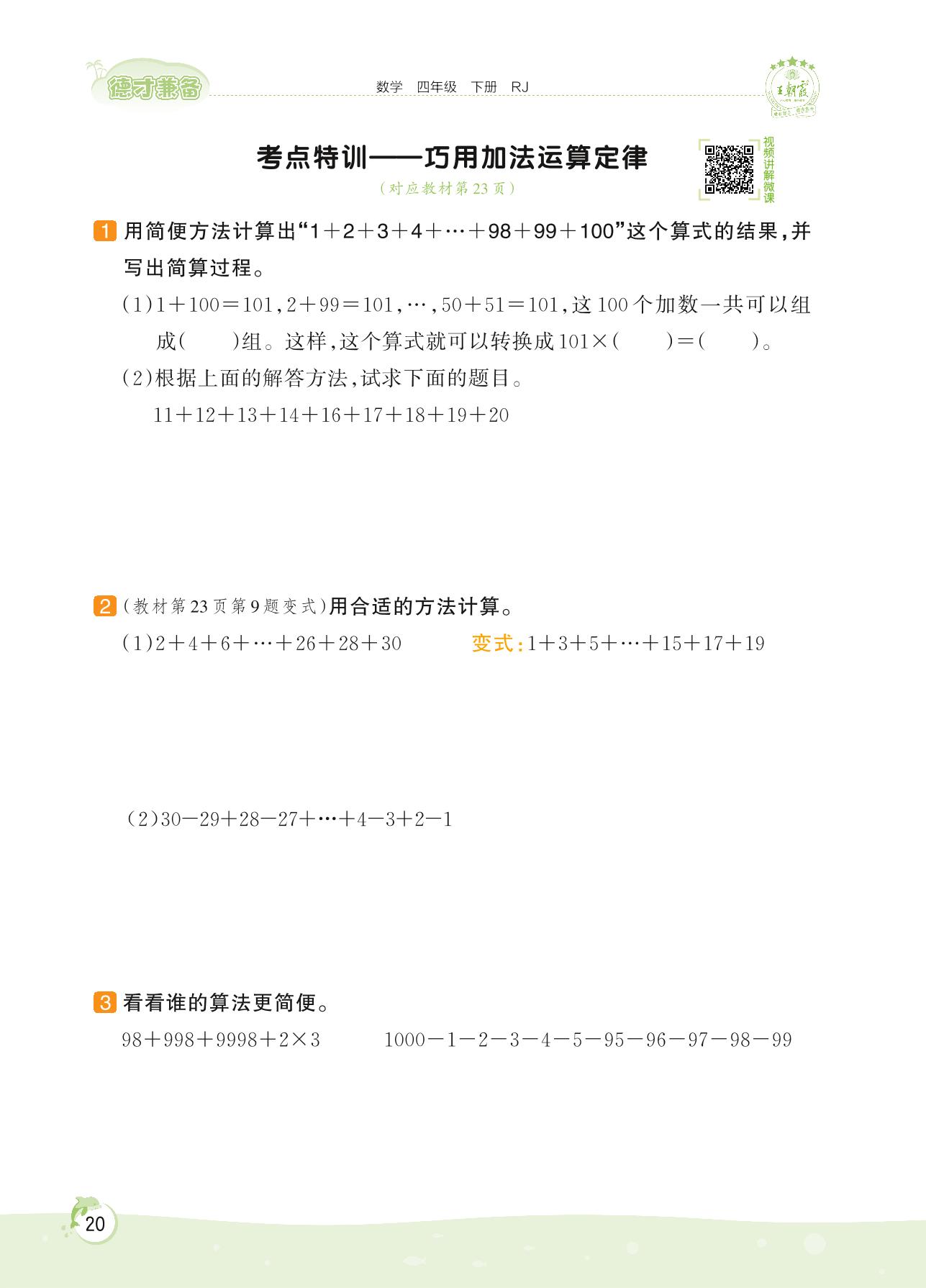 2022下册四年级数学人教版 第三单元——考点特训 巧用加法运算定律