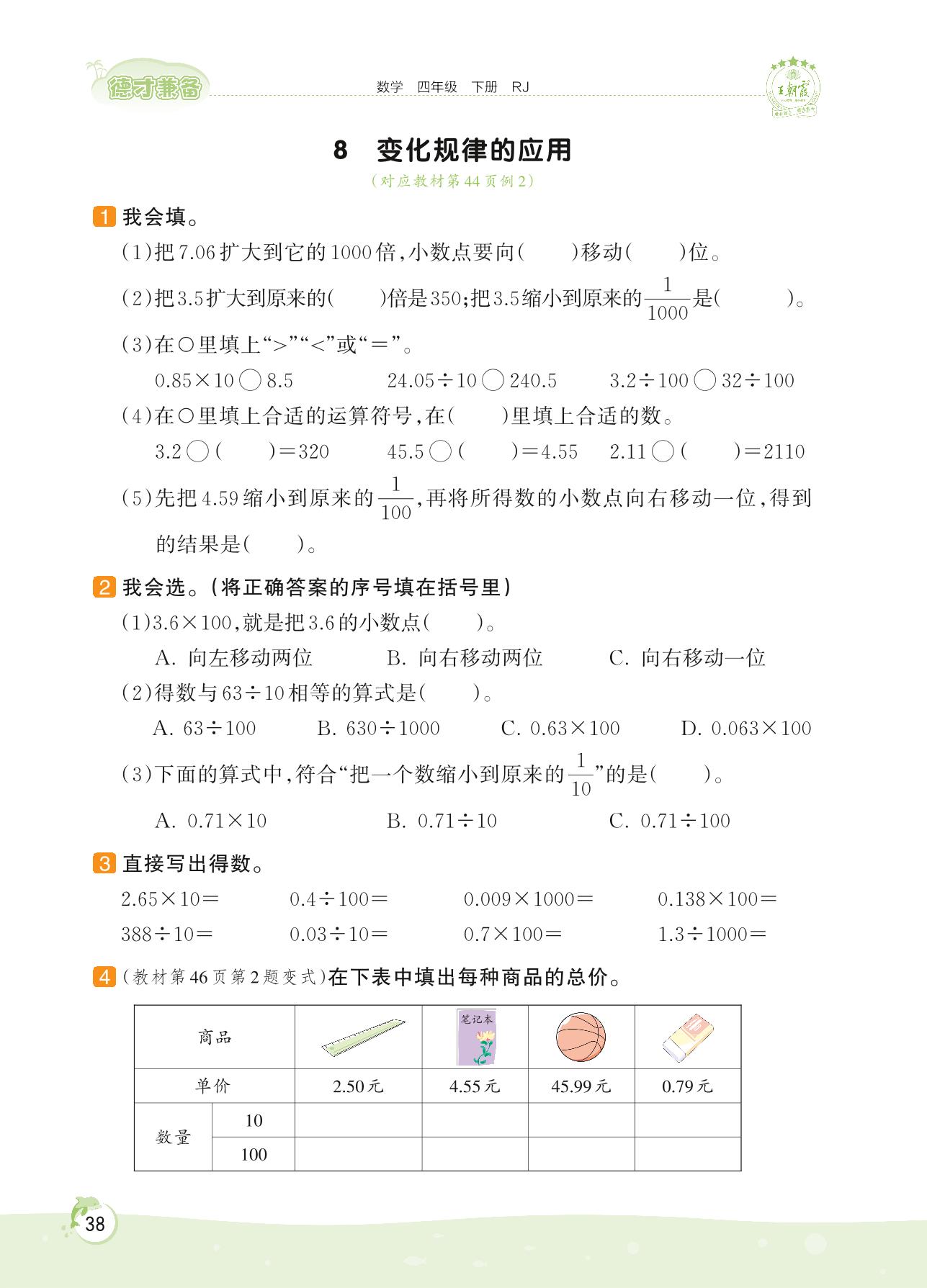 2022下册四年级数学人教版 第四单元——8 变化规律的应用