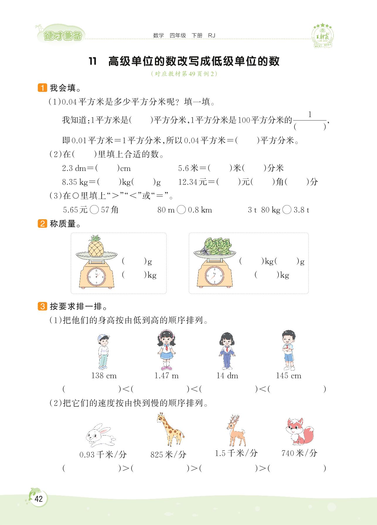 2022下册四年级数学人教版 第四单元——11 高级单位的数改写成低级单位的数