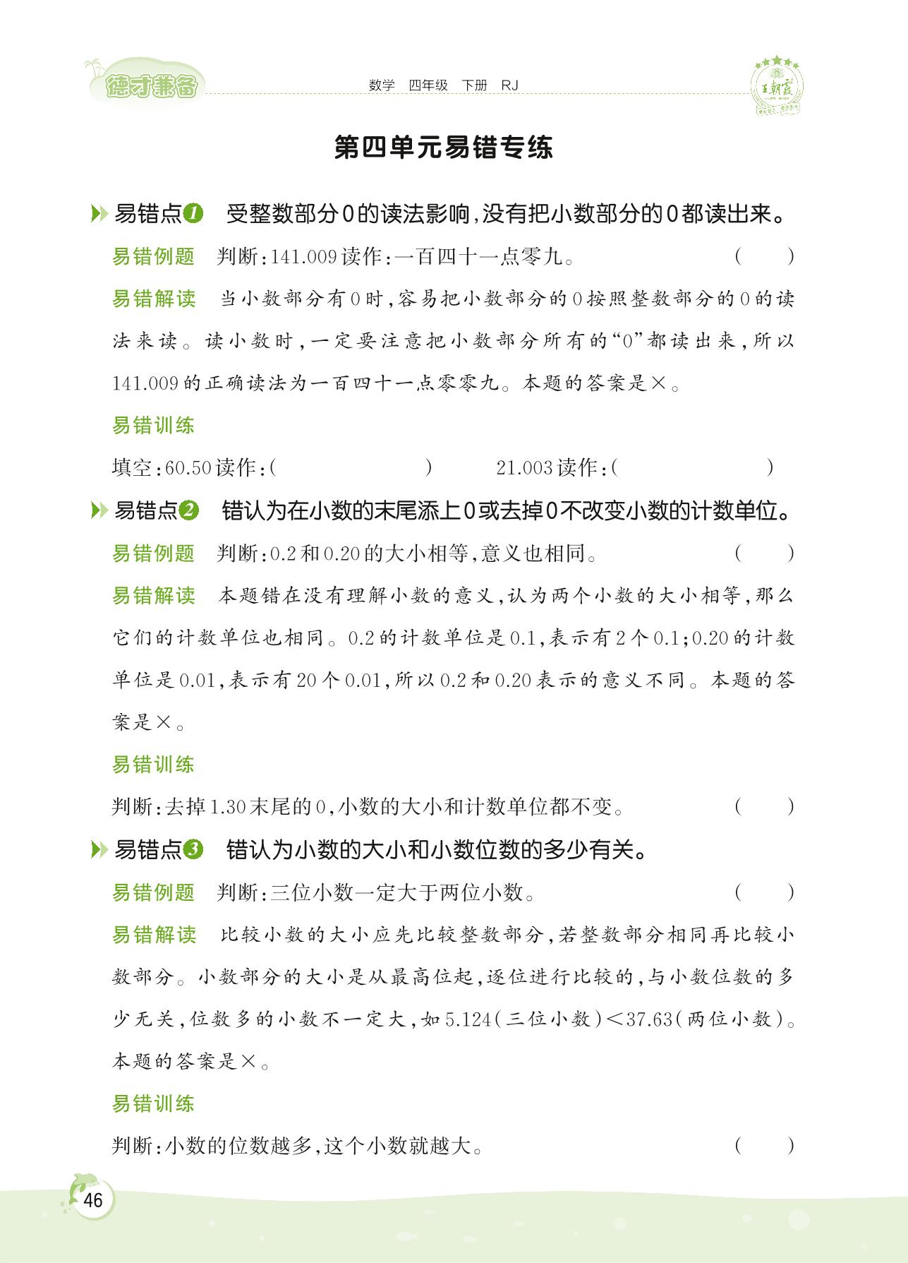 2022下册四年级数学人教版 第四单元易错专练