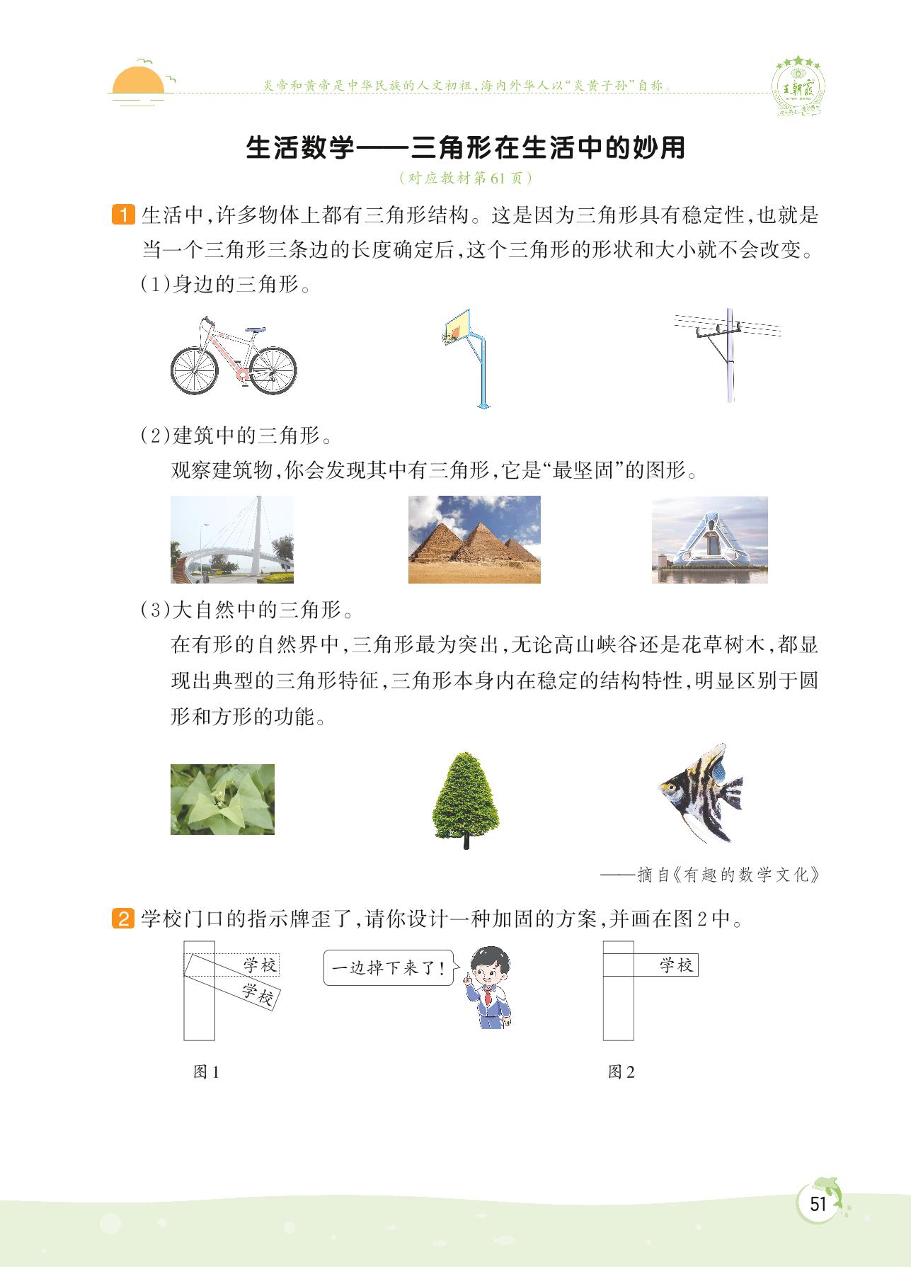 2022下册四年级数学人教版 第五单元——生活数学 三角形在生活中的妙用