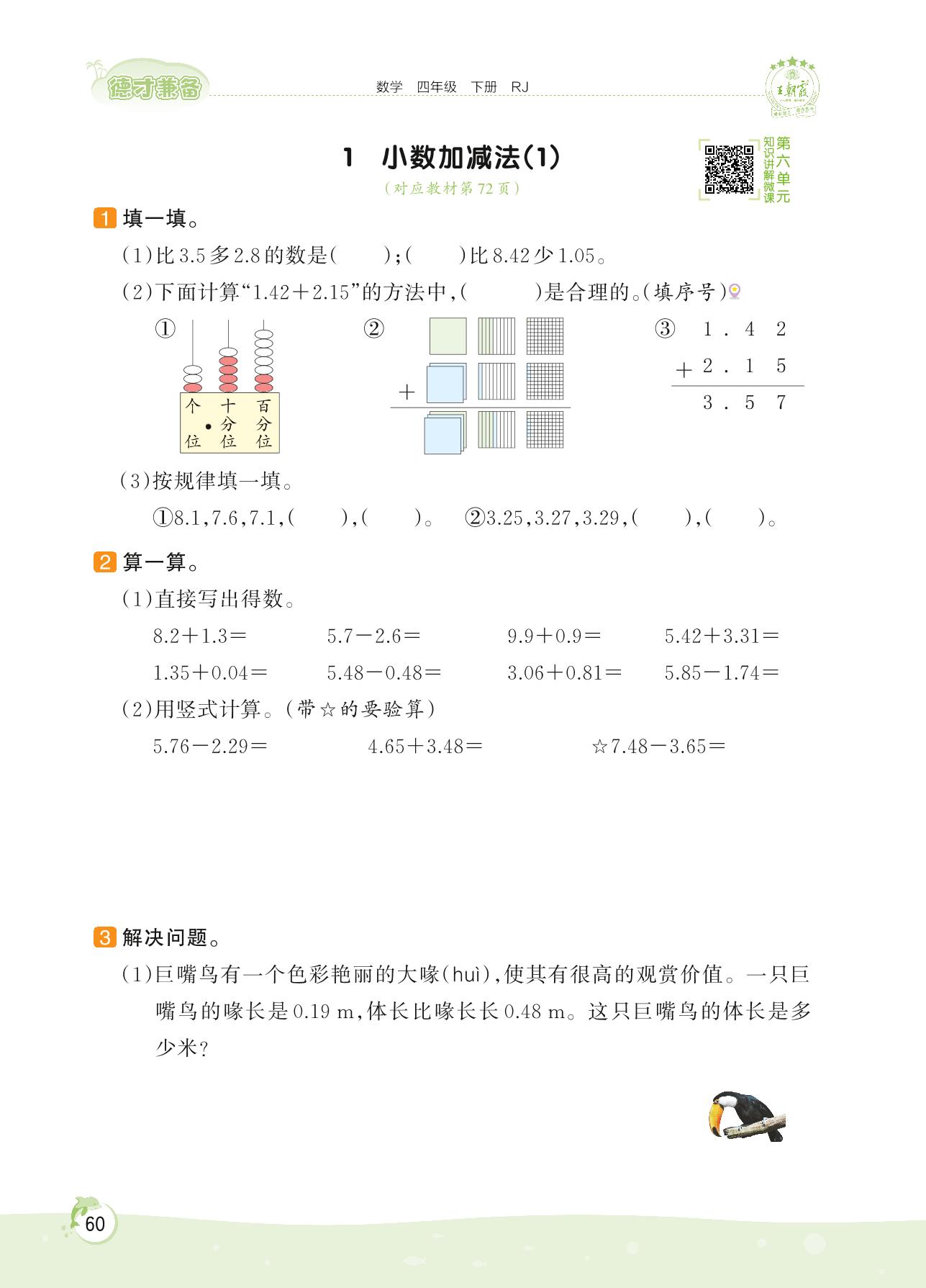 2022下册四年级数学人教版 第六单元——1 小数加减法(1)