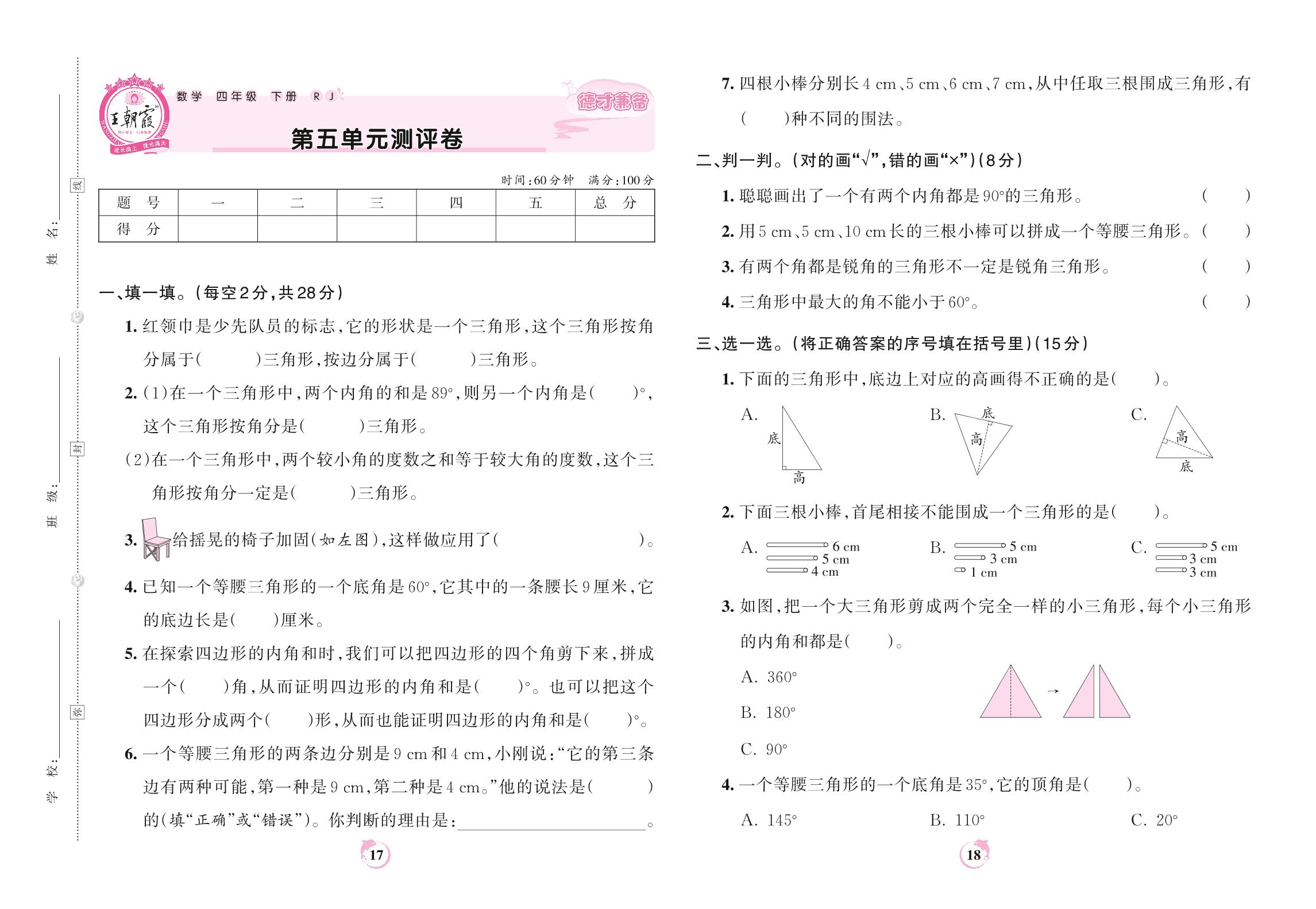 四年级数学人教版下册单元卷