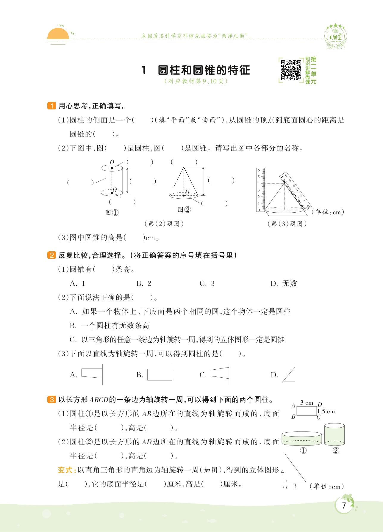 2022下册六年级数学苏教版 第二单元——1 圆柱和圆锥的特征