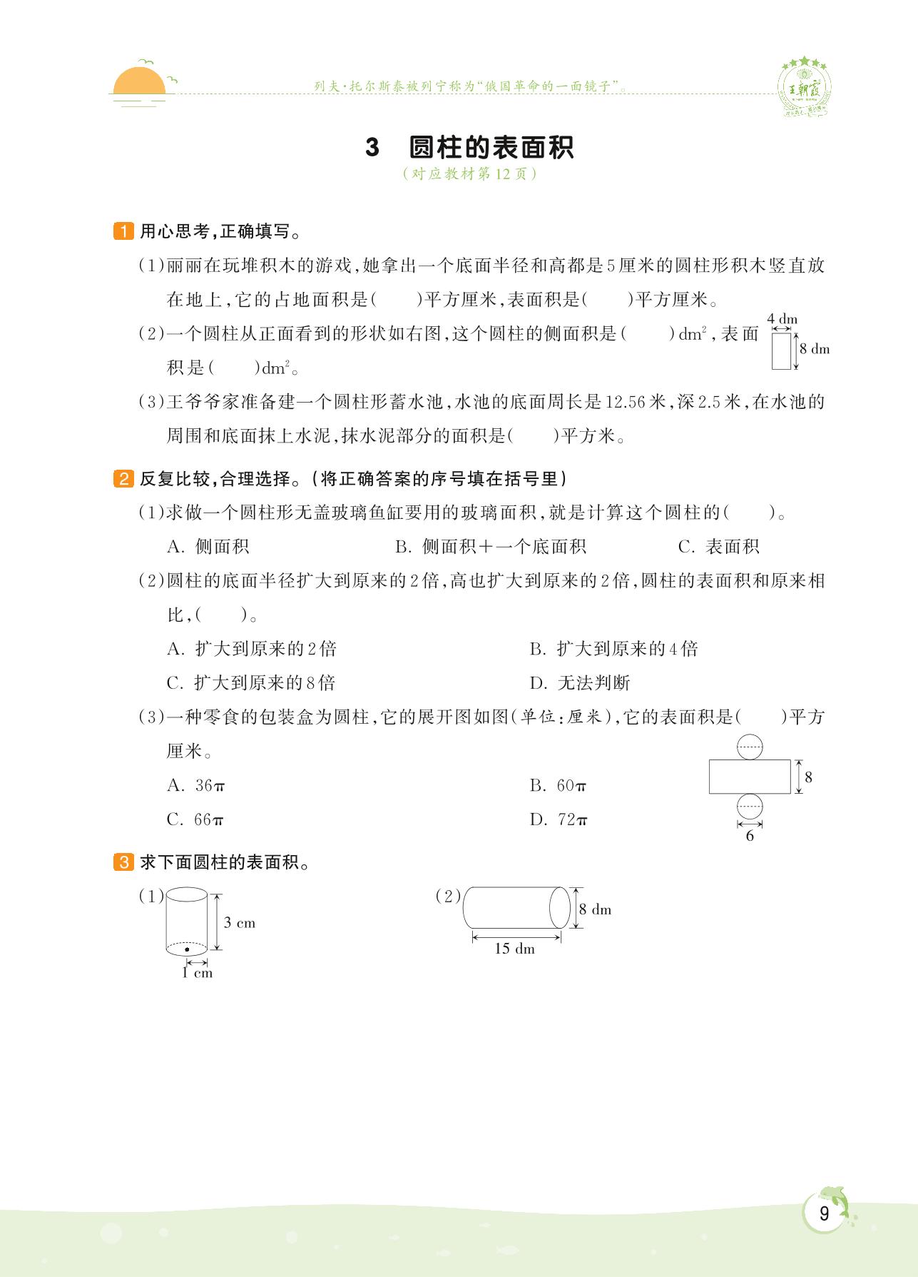 2022下册六年级数学苏教版 第二单元——3 圆柱的表面积