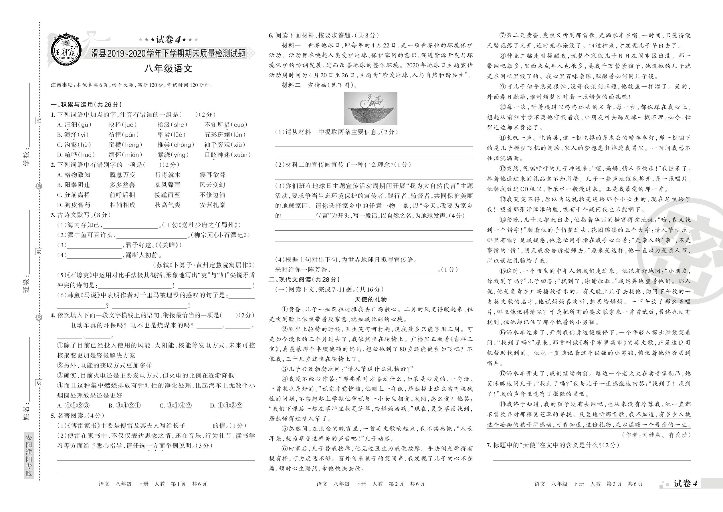 2019-2020学年第二学期安阳市滑县八年级语文试卷(人教版)【4】