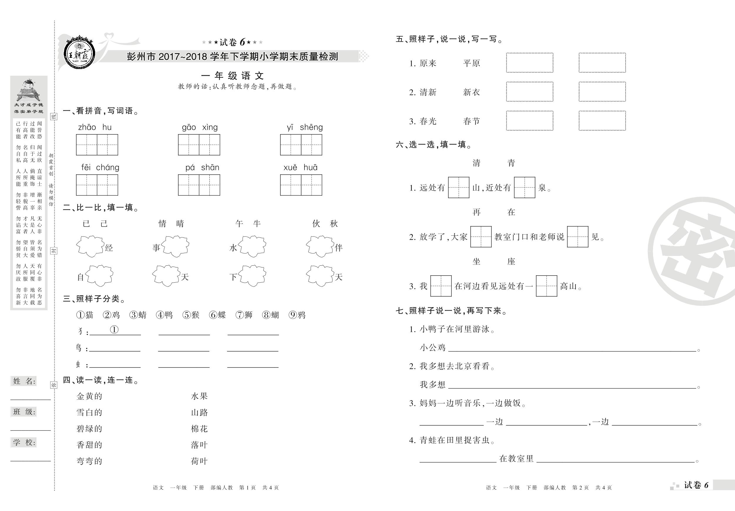 2017-2018学年第二学期彭州市一年级语文试卷(人教版)【6】