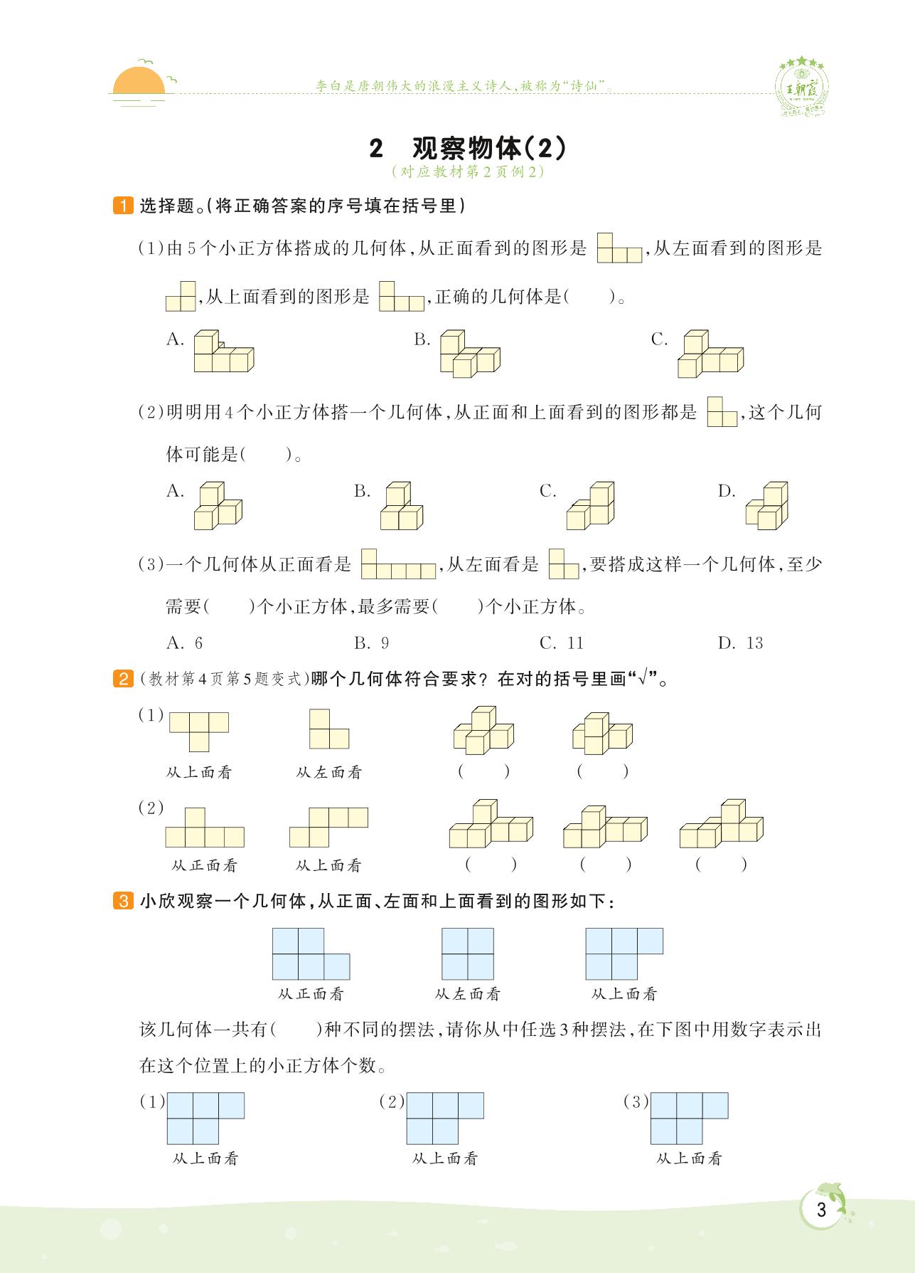 2022下册五年级数学人教版 第一单元——2 观察物体(2)