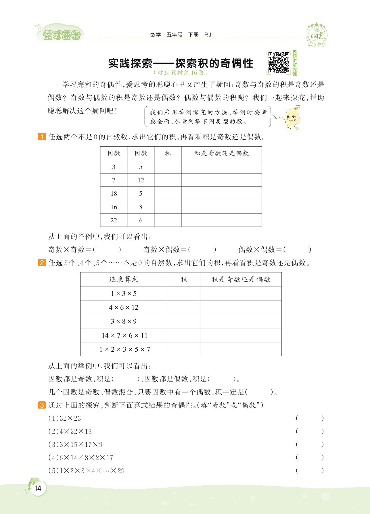 2022下册五年级数学人教版 第二单元——实践探索 探索积的奇偶性