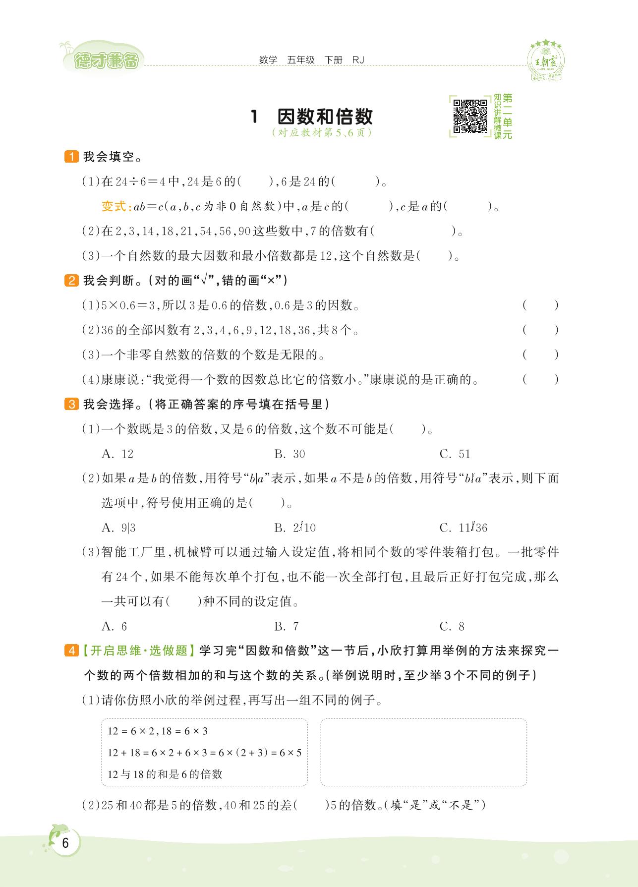 2022下册五年级数学人教版 第二单元——1 因数和倍数