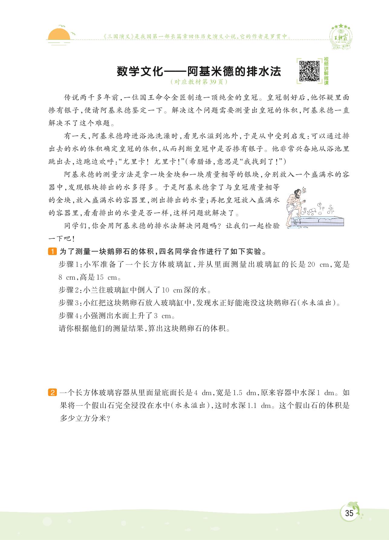 2022下册五年级数学人教版 第三单元——数学文化 阿基米德的排水法