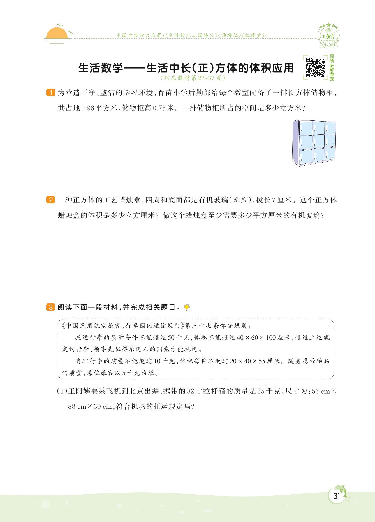 2022下册五年级数学人教版 第三单元——生活数学 生活中长(正)方体的体积应用