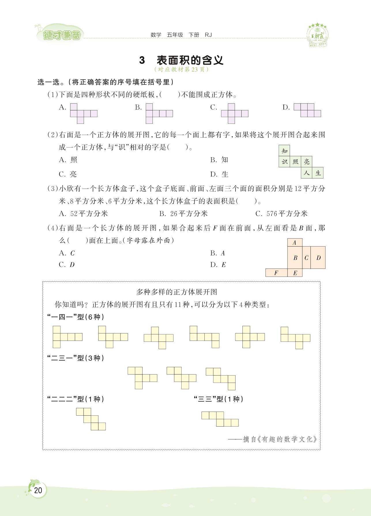 2022下册五年级数学人教版 第三单元——3 表面积的含义